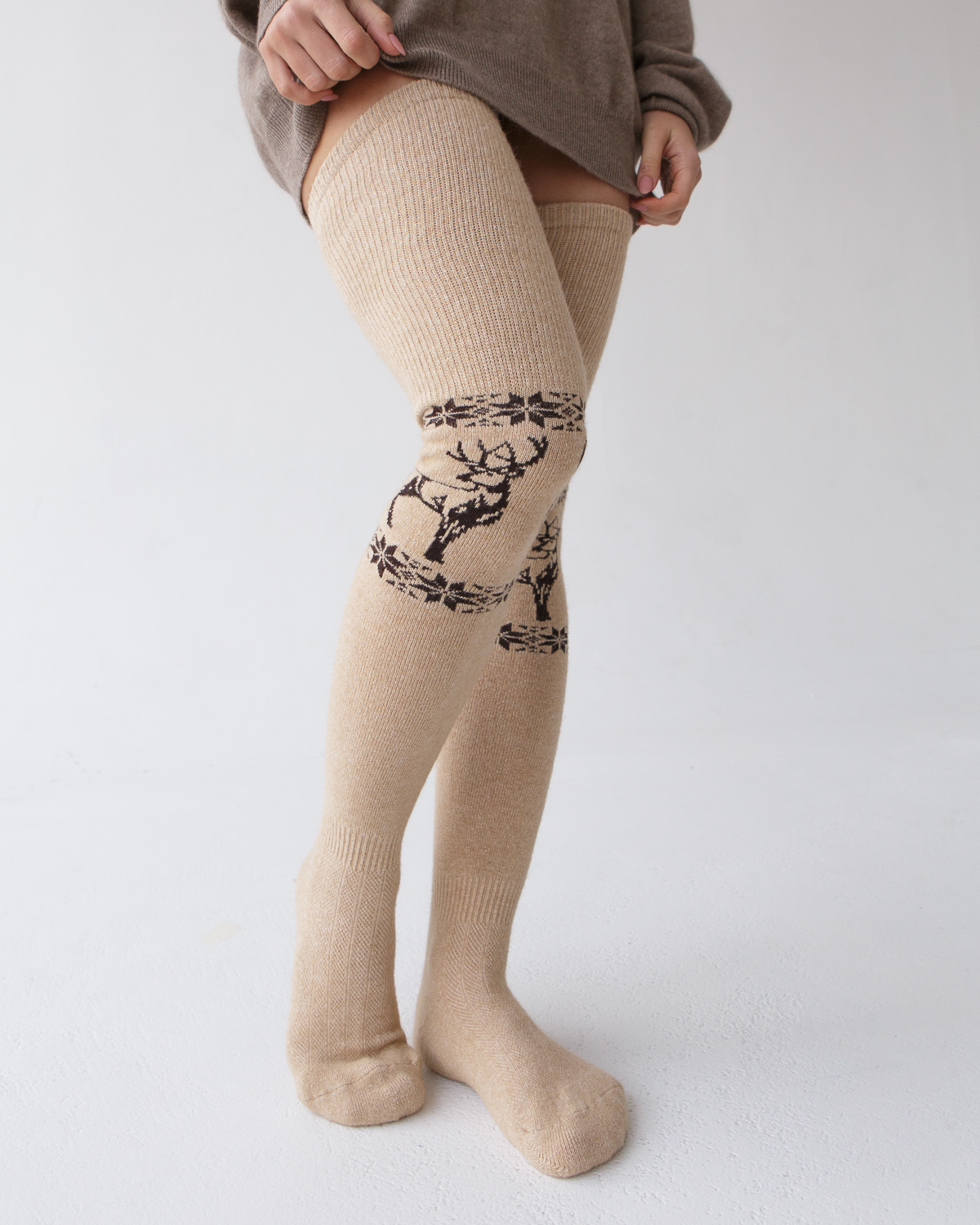 Теплые чулки из монгольской шерсти бежевые с рисунком