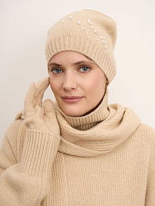 Классическая вязаная модель с аккуратной резинкой по краю и гладкой верхней частью. Декоративные жемчужные элементы добавляют изящества и легкого сияния, не перегружая образ. Лаконичный силуэт и продуманная плотность вязки обеспечивают аккуратный внешний вид и устойчивость формы.