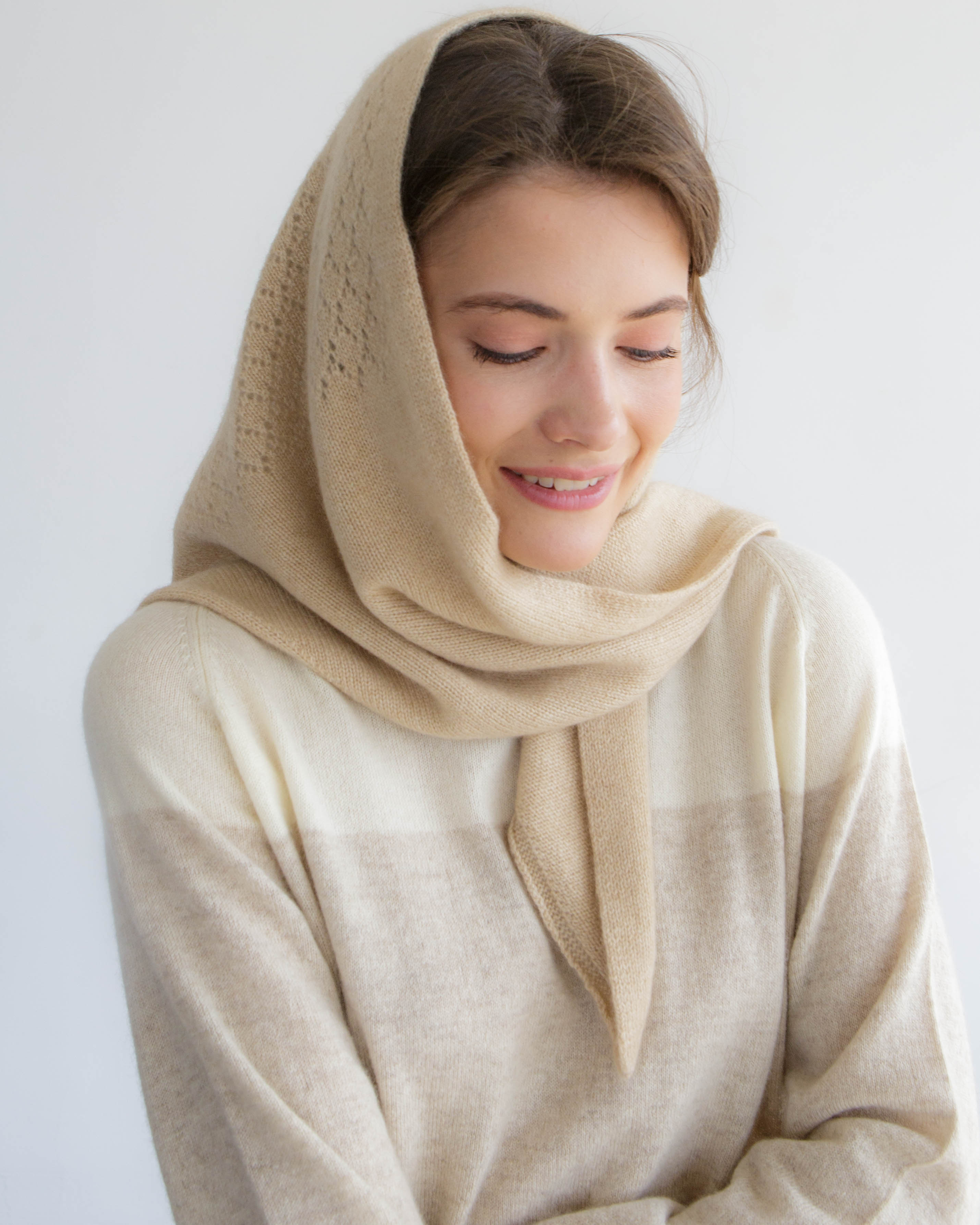 Косынка легко драпируется и может носиться как на голове, так и на шее или плечах. Лаконичный дизайн подчёркивает натуральную текстуру кашемира и универсальность модели.