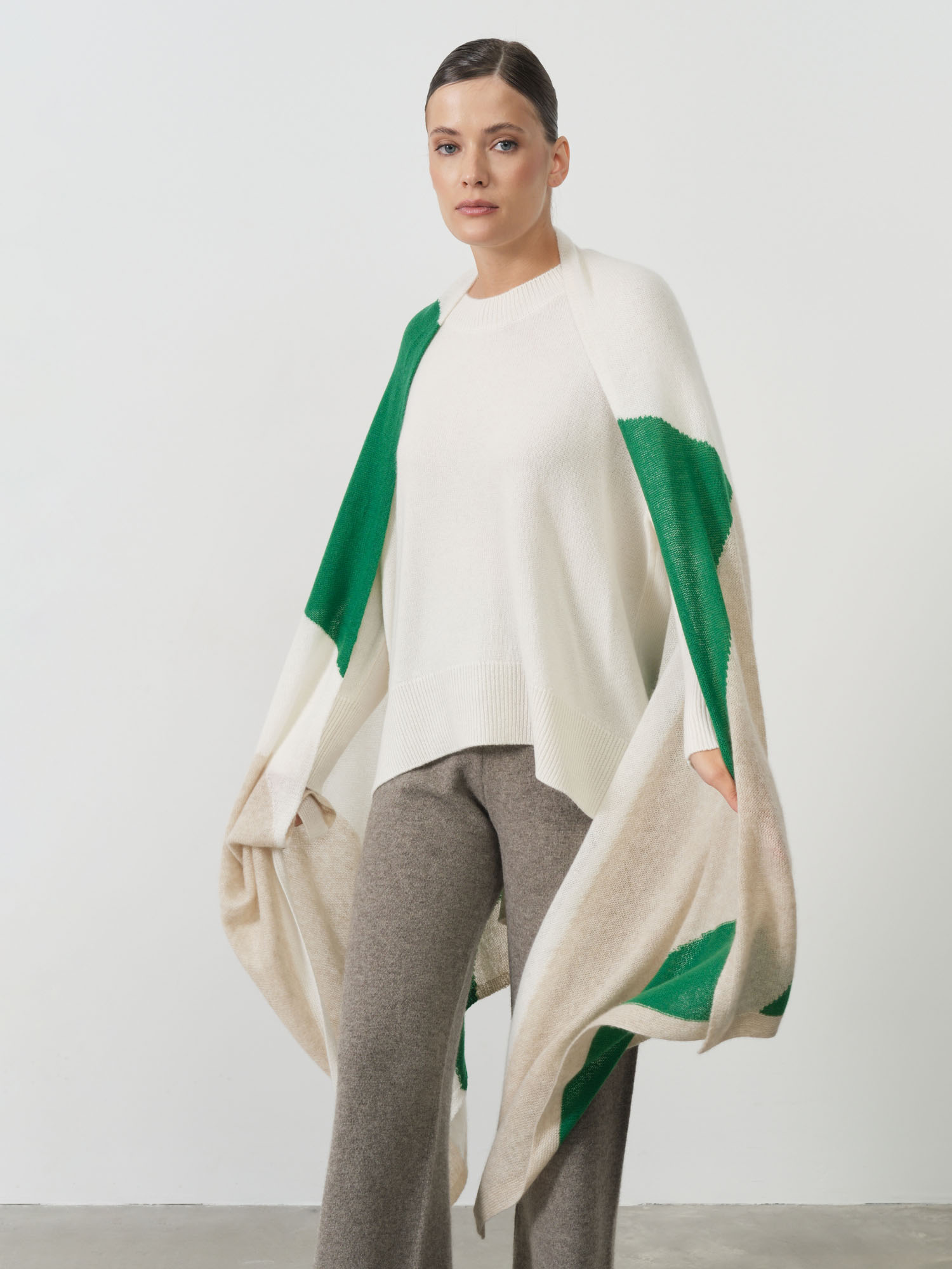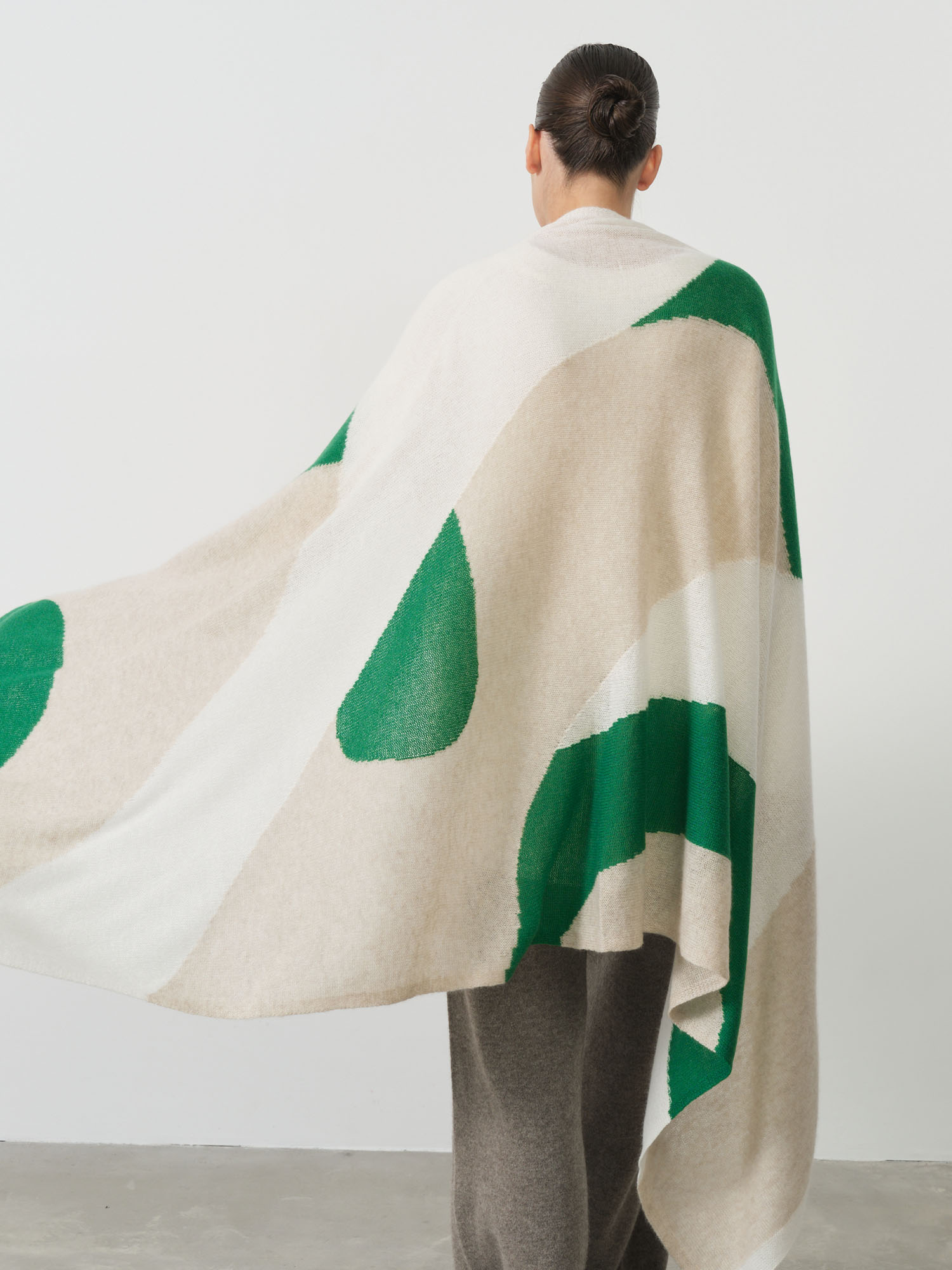 Свободная форма и крупные цветовые элементы создают выразительный графичный дизайн. Лёгкая и пластичная структура кашемира позволяет изделию красиво струиться и формировать мягкие складки.