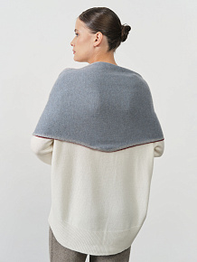 Модель выполнена в мягкой треугольной форме, что позволяет красиво драпировать изделие вокруг шеи или носить как лёгкую накидку. Контрастная окантовка по краю добавляет изделию выразительности и аккуратно подчёркивает форму аксессуара.