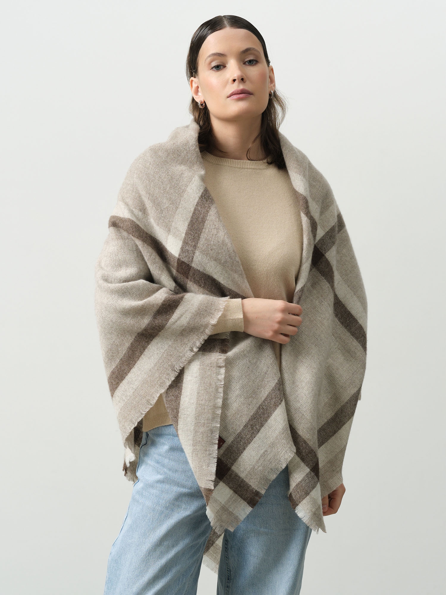 Бежево-серая основа с контрастной коричневой клеткой — гармоничное сочетание природных оттенков, которое легко вписывается в базовый гардероб.
