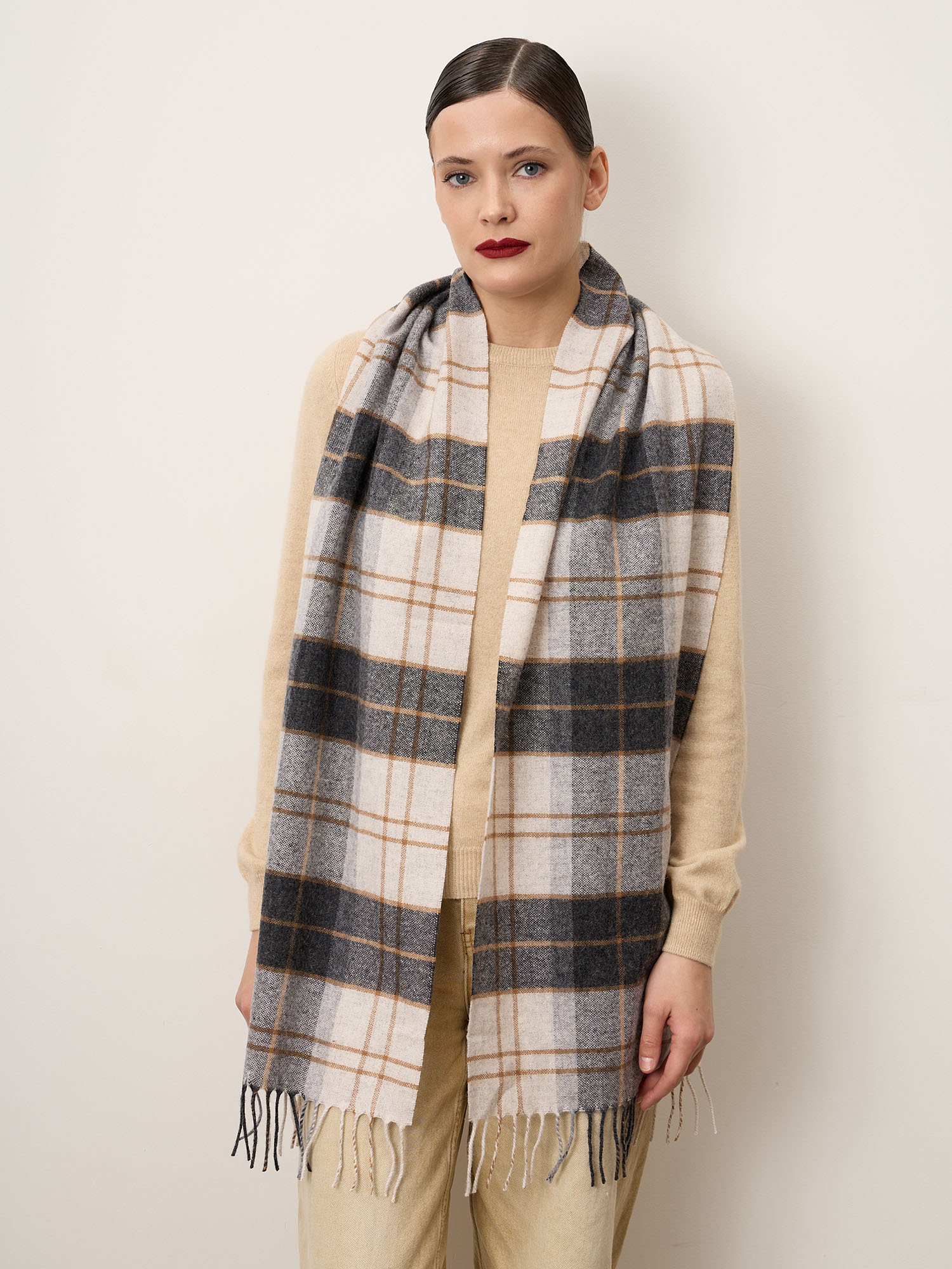 Классический прямоугольный формат позволяет носить шарф различными способами. Традиционный клетчатый узор придаёт изделию стильный характер, а аккуратная бахрома по краям добавляет лёгкий декоративный акцент. Модель легко сочетается с верхней одеждой и трикотажем.