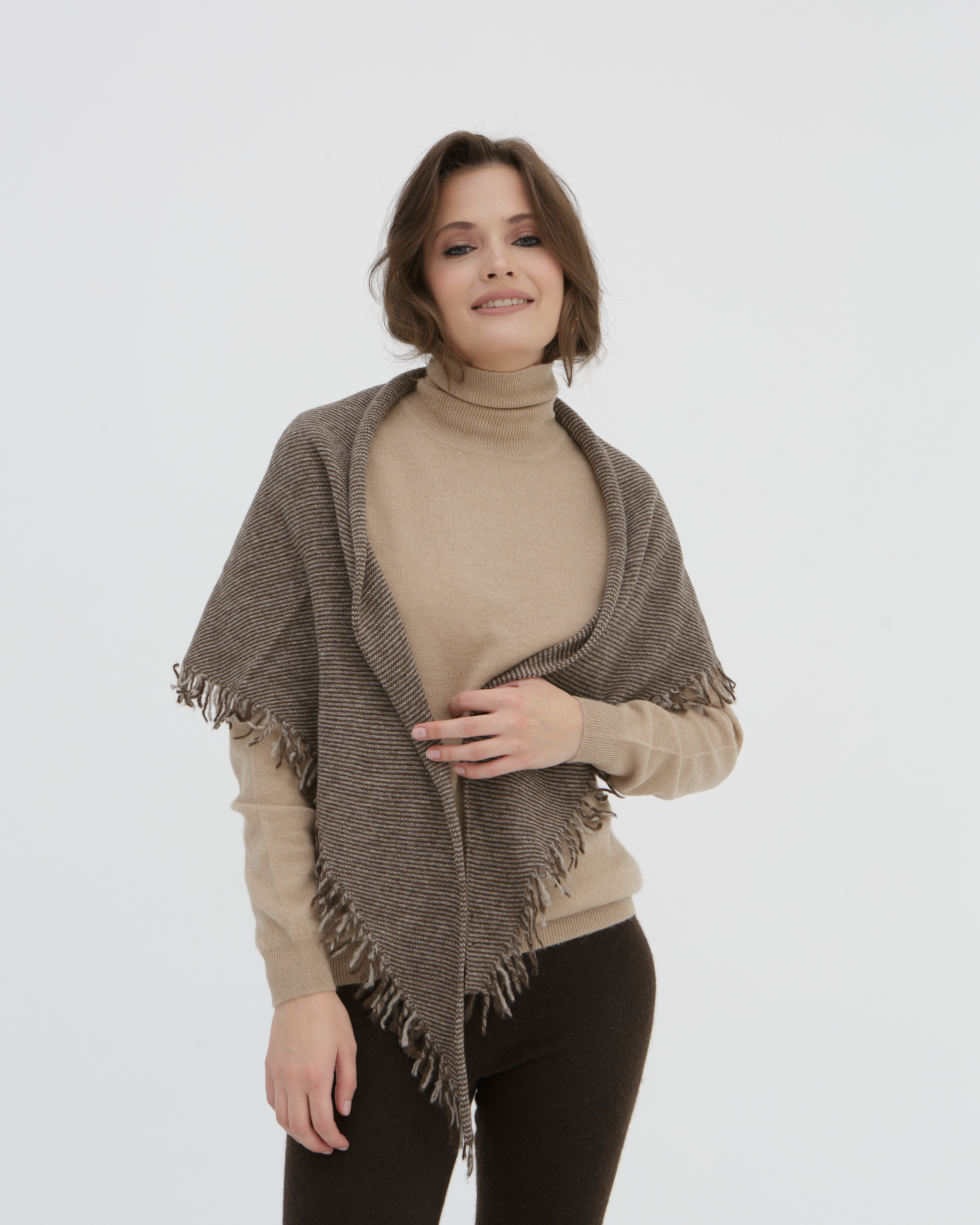 Треугольная форма косынки с фактурной вязкой и аккуратным полосатым рисунком. По краям изделие дополнено декоративной бахромой, которая придаёт аксессуару динамичность и лёгкость. Косынка красиво драпируется и сохраняет форму.