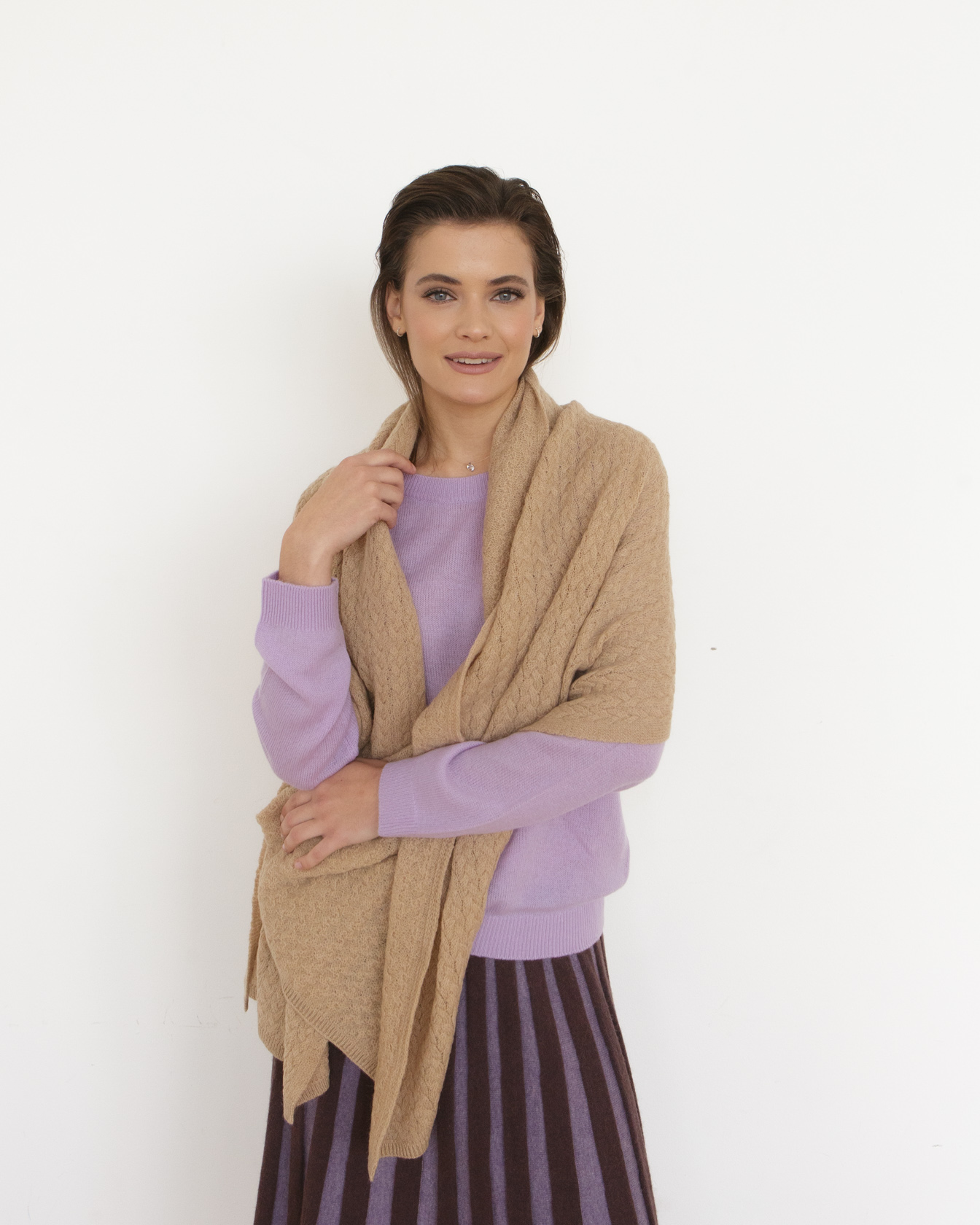 Мягкий, легкий и приятный к коже палантин хорошо драпируется и позволяет создавать различные способы ношения — на плечах, вокруг шеи или в виде уютной накидки.