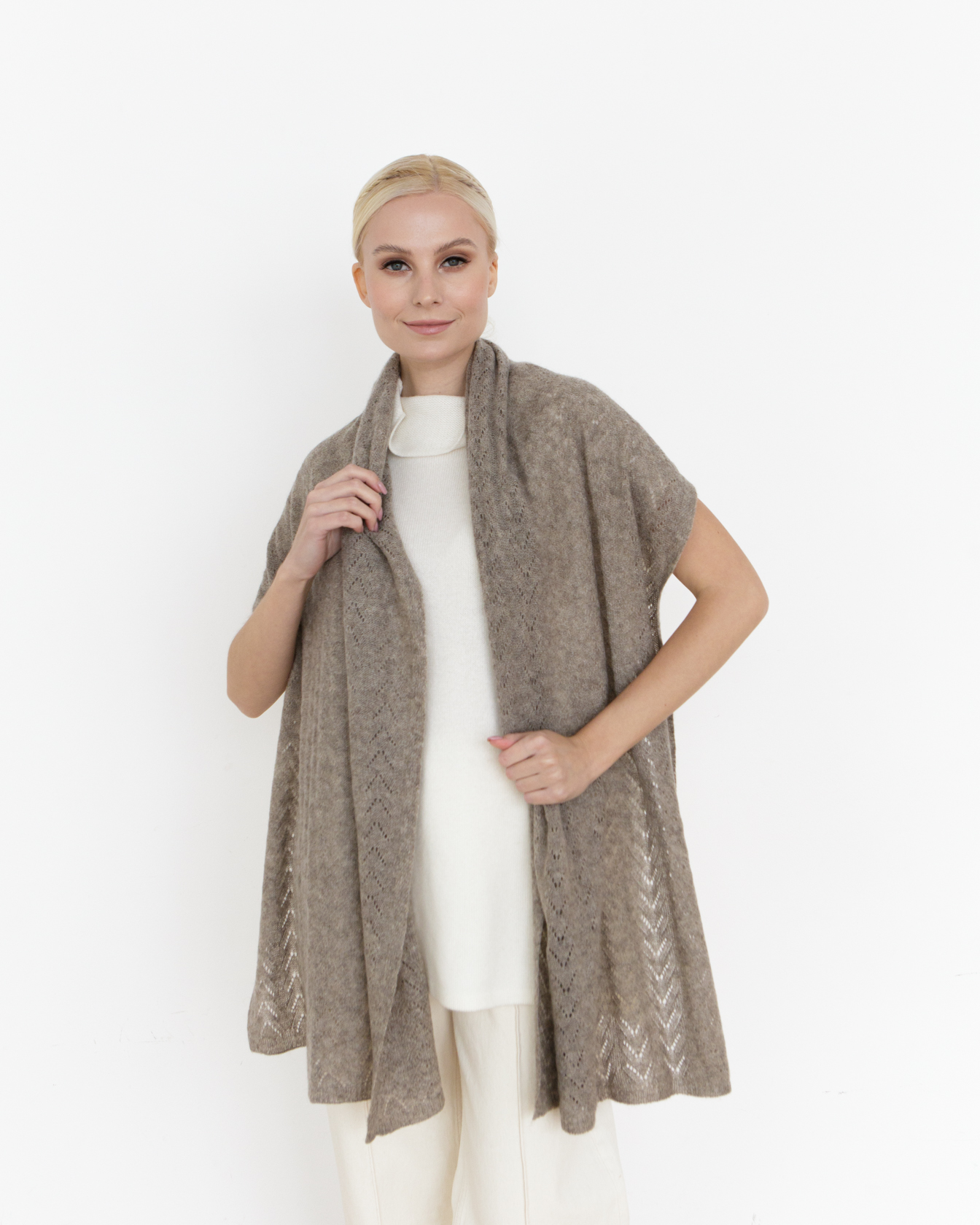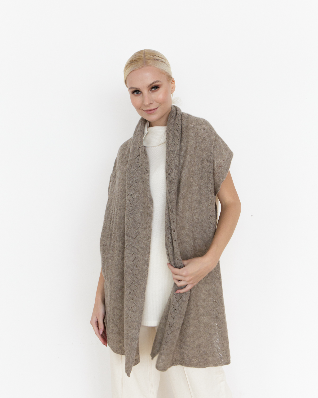 Модель выполнена в классической прямоугольной форме с аккуратной фактурной вязкой. Лаконичный дизайн делает палантин универсальным аксессуаром, который легко сочетать с пальто, кардиганами и трикотажем.