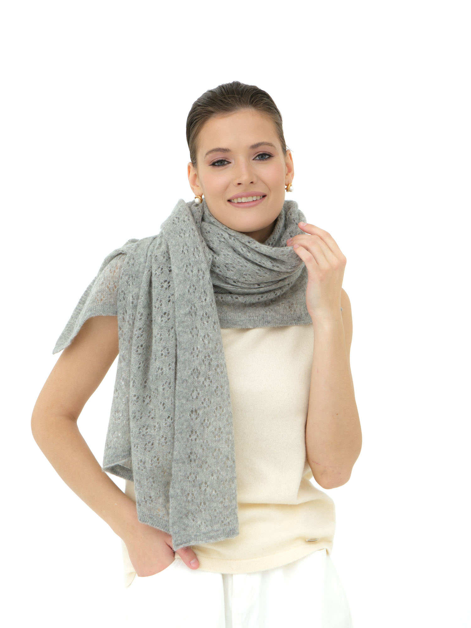 Модель выполнена в свободной форме с выразительной фактурной вязкой, создающей объёмную текстуру. Пластичная структура материала позволяет палантину красиво струиться и формировать мягкие складки.