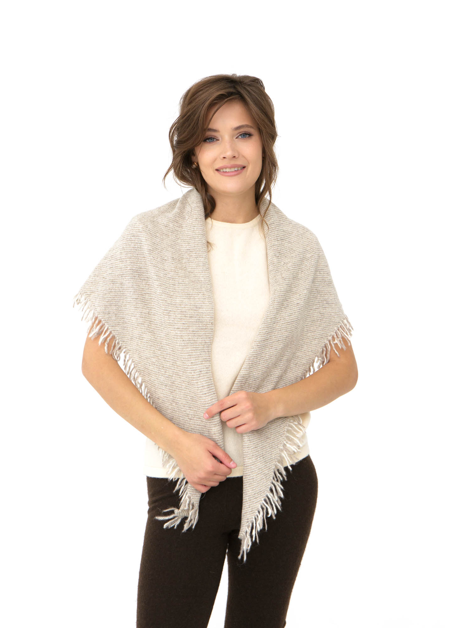 Модель выполнена в форме косынки с аккуратным полосатым рисунком. Края украшены декоративной бахромой, которая придаёт аксессуару лёгкость и завершённый вид.