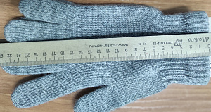 Перчатки из меланжевой пряжи серого цвета, плотные. Отправляю реальное фото с замером длины. |