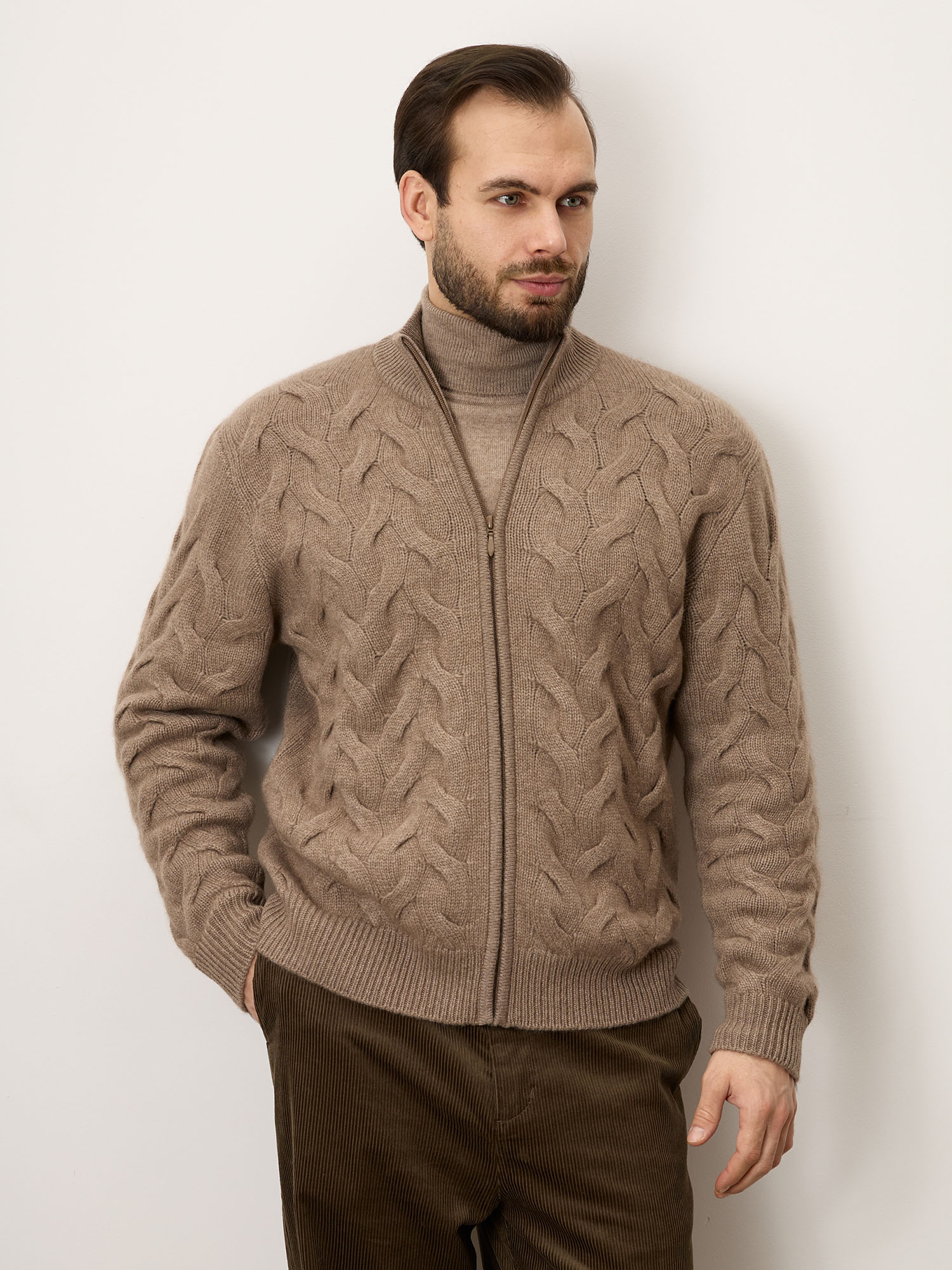 Классический силуэт с фактурной вязкой в виде кос. Аккуратный воротник на молнии добавляет функциональности и современного стиля.