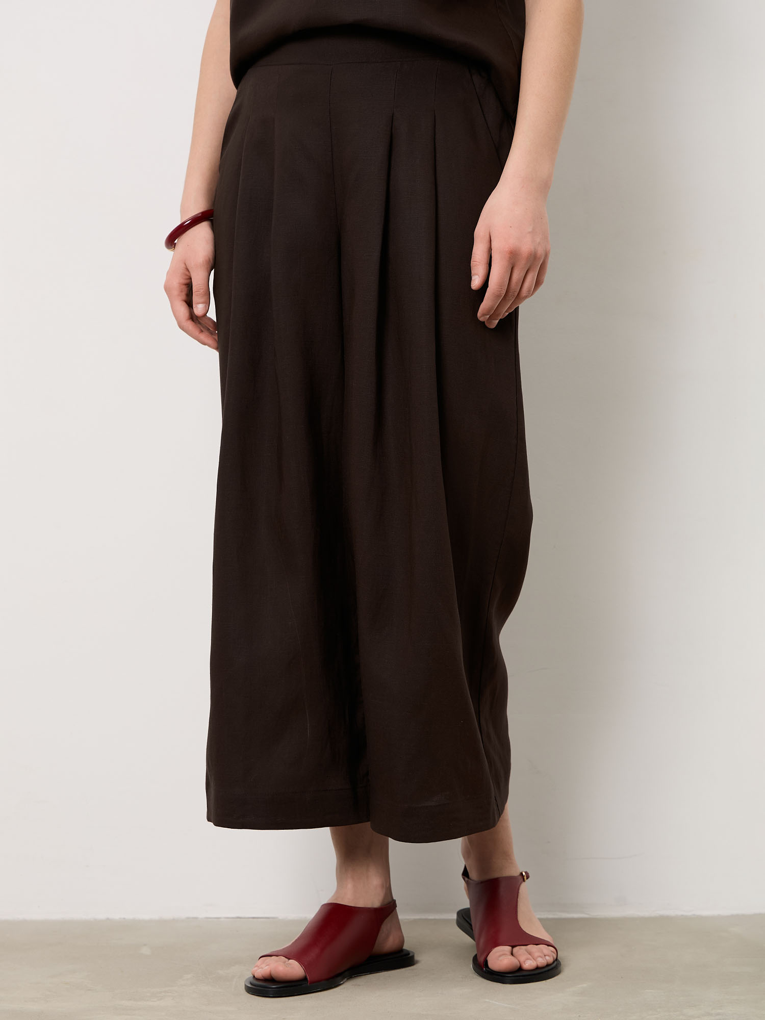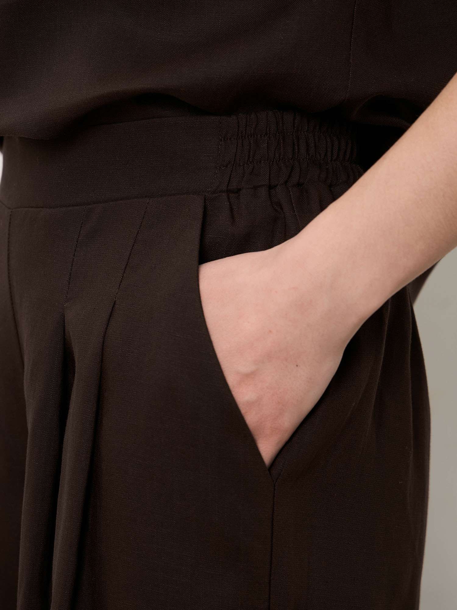 Комфортная посадка по талии и свободная линия брючин обеспечивают свободу движений. Лёгкая натуральная ткань приятно ощущается на коже и подходит для длительной носки.