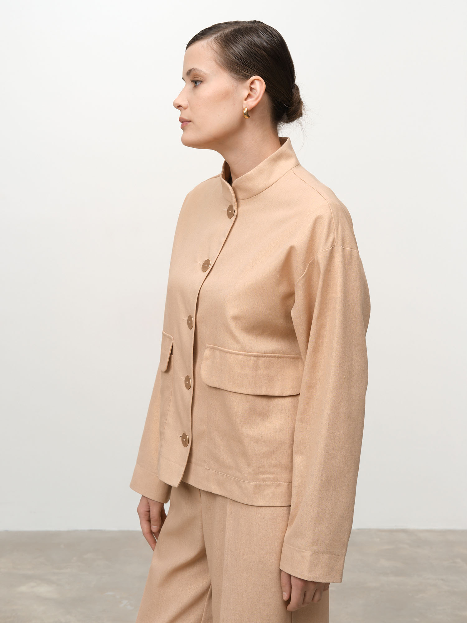 Застежка на пуговицы, накладные карманы, воротник-стойка, аккуратная обработка швов, легкая фактурная ткань.