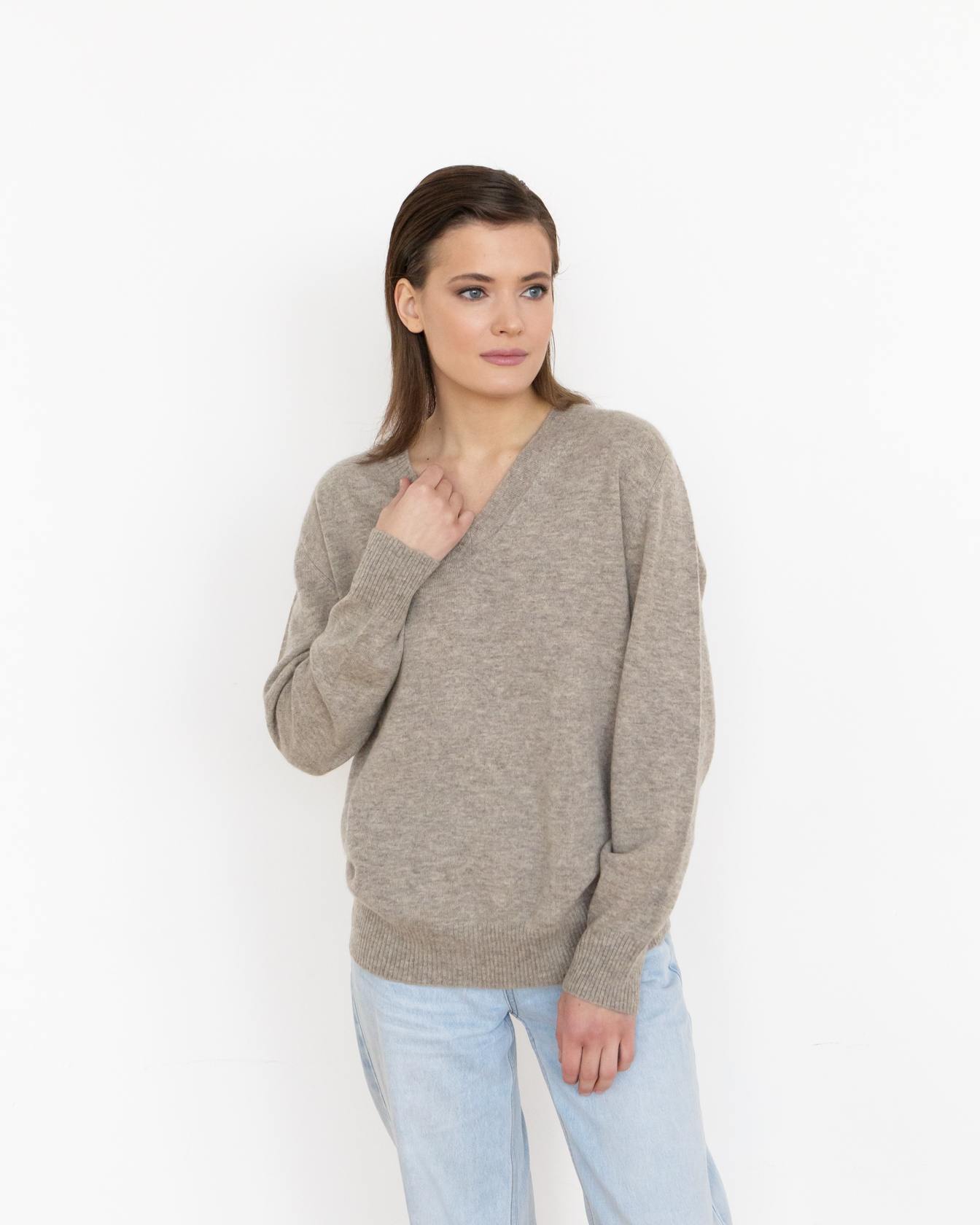 V-образная горловина, аккуратная трикотажная отделка манжет и нижнего края изделия. Ровная вязка сохраняет форму и подчёркивает аккуратность силуэта.
