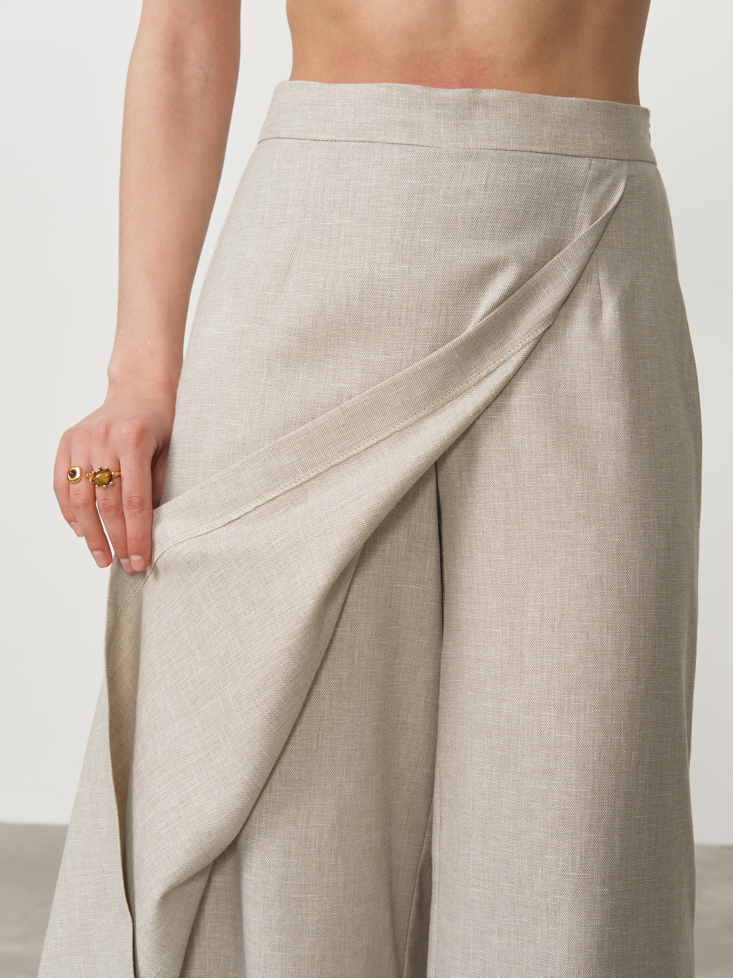 Эффект запаха с аккуратной драпировкой спереди, скрытая конструкция брюк, чистая линия по талии, аккуратные швы.