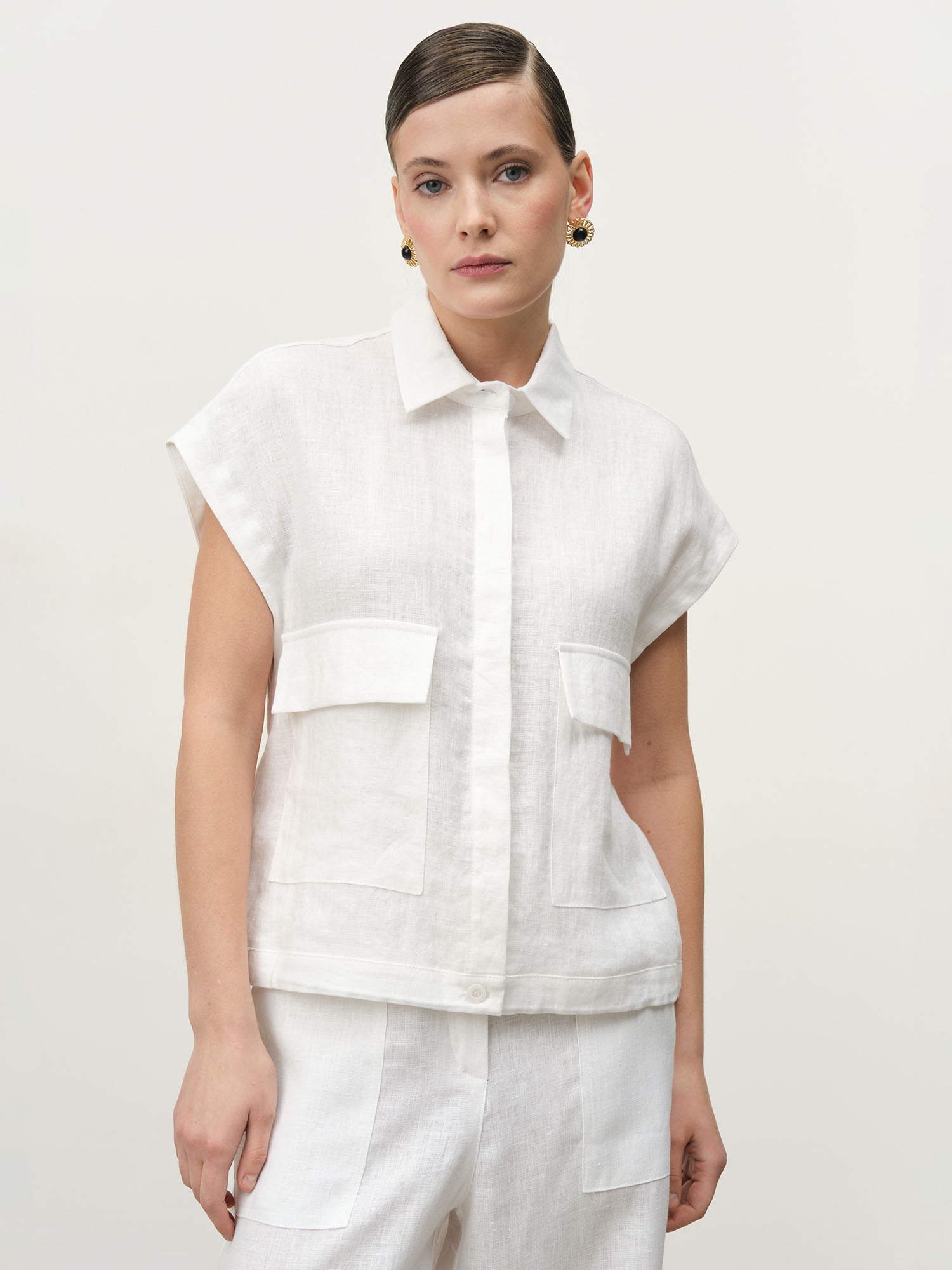 Накладные карманы, застёжка на пуговицы, короткий рукав, аккуратная обработка швов.