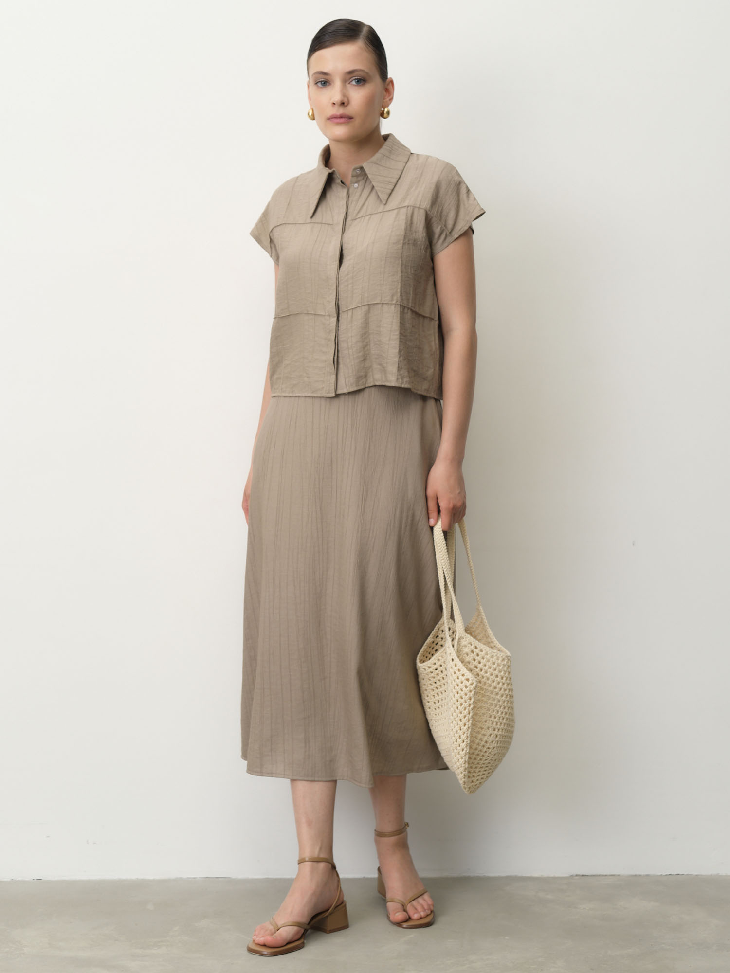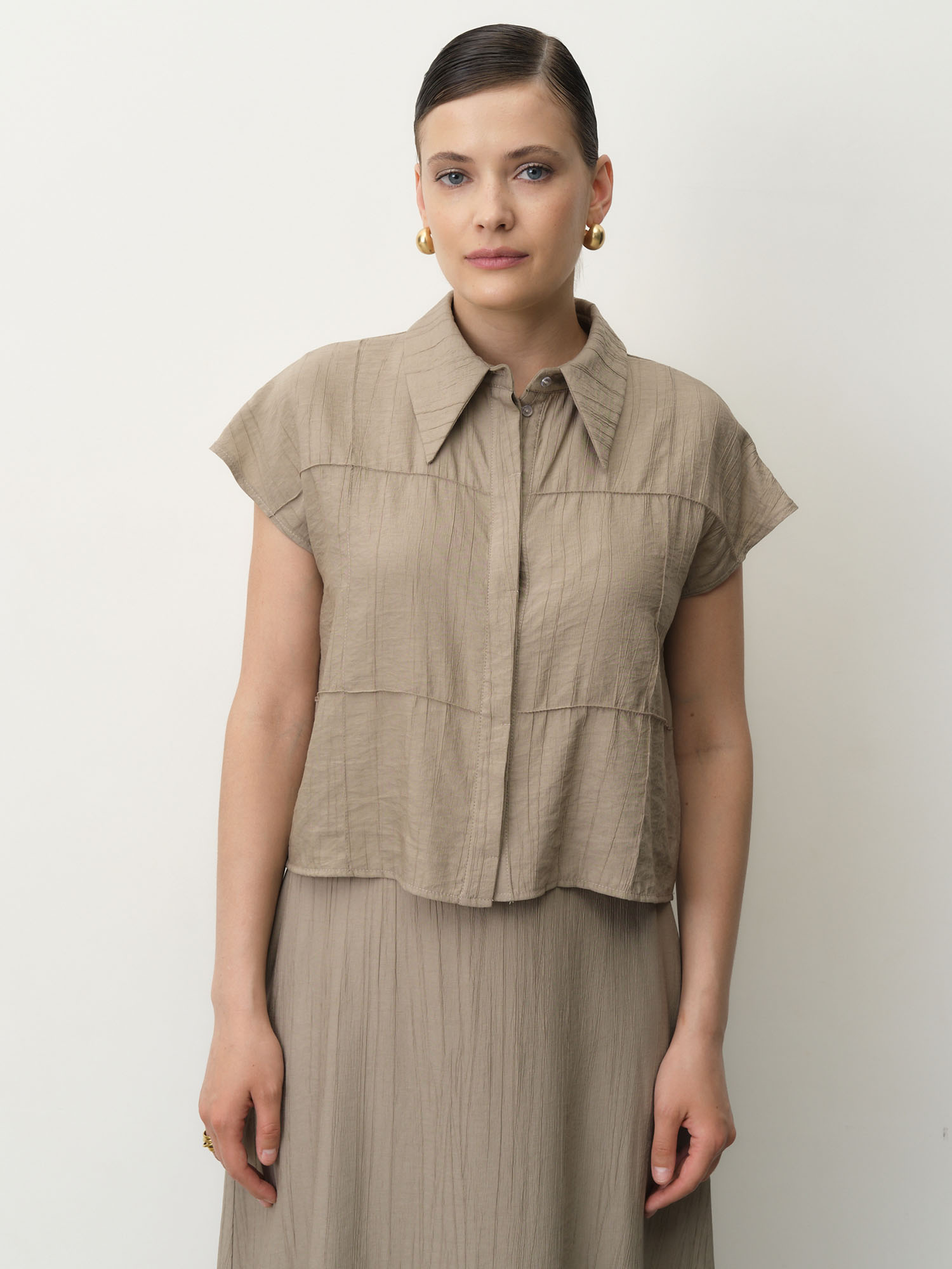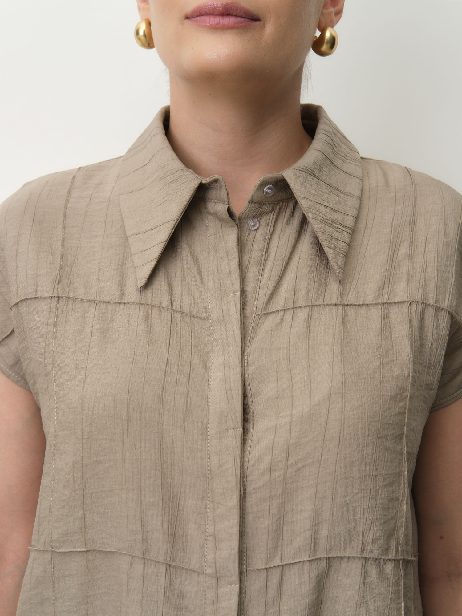 Свободный крой с укороченными рукавами и отложным воротником. Модель дополнена ярусной конструкцией, придающей объём и динамику.