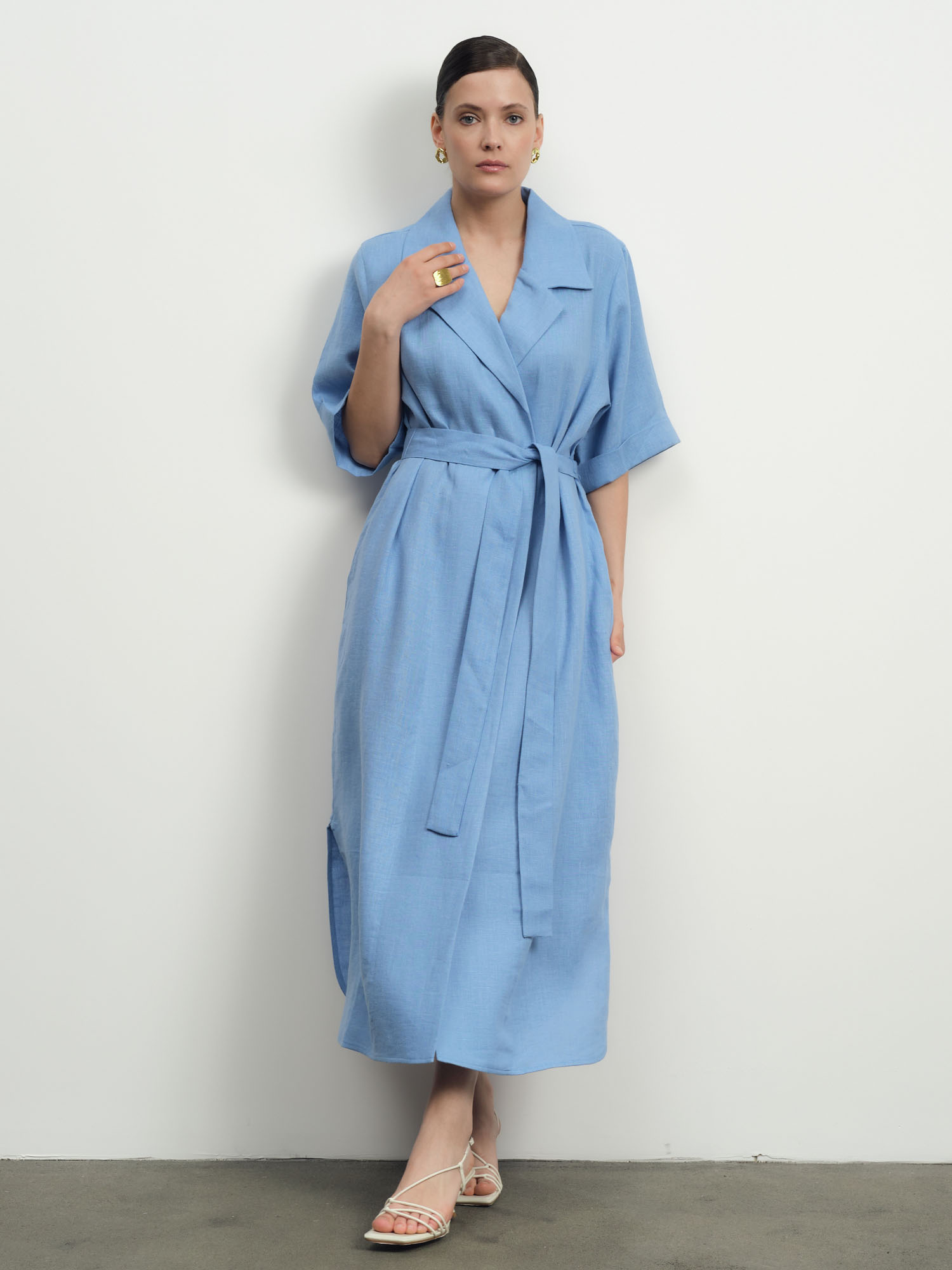 Платье миди длины с запахом и свободным силуэтом. Короткие рукава и мягкие линии создают расслабленный и утонченный образ.