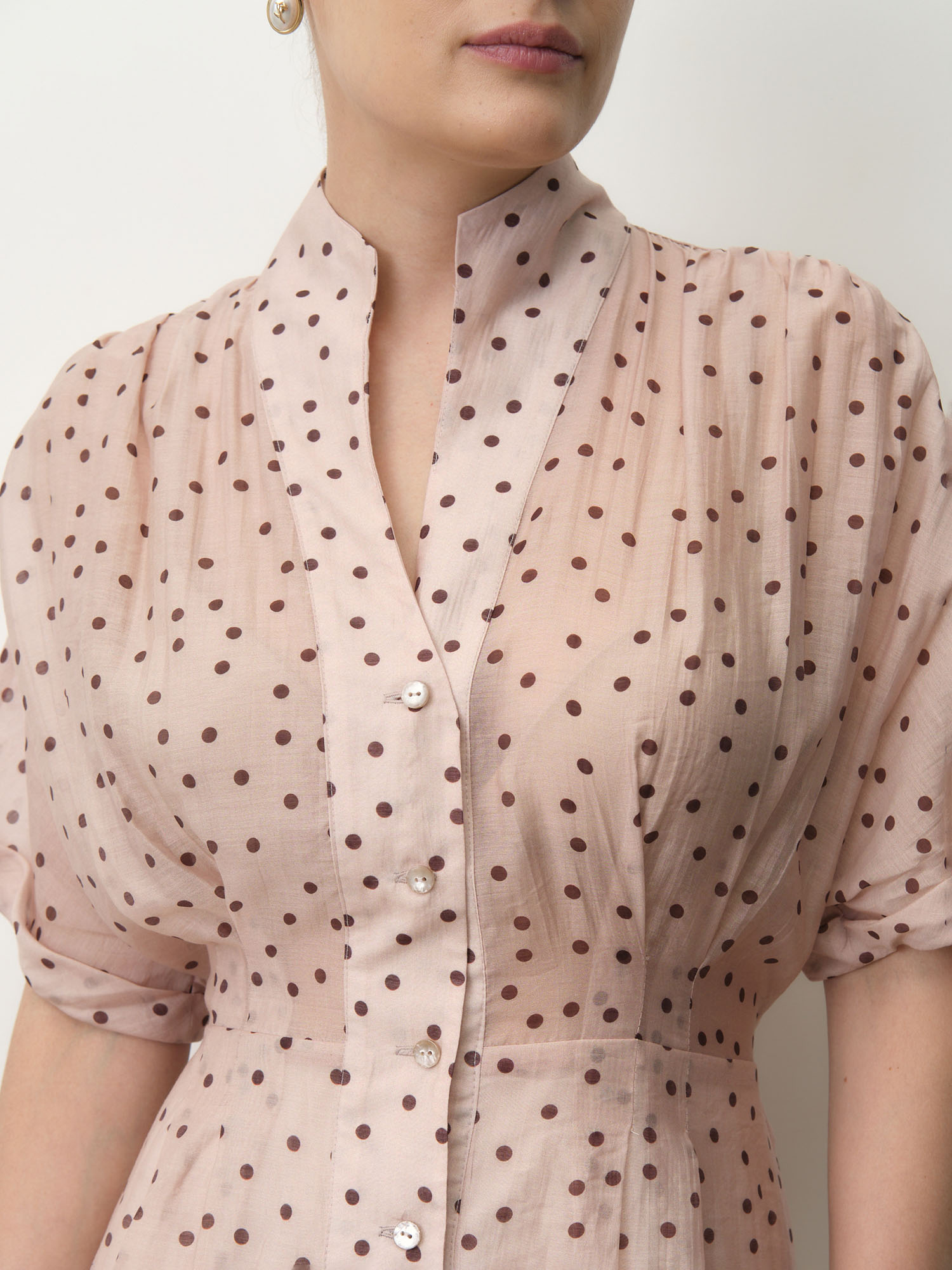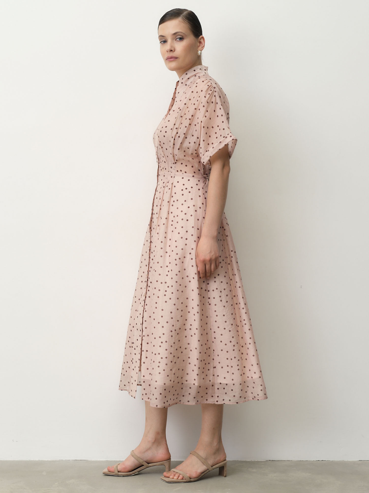 Пудровый в горошек — нежное и утонченное сочетание, придающее образу легкость и романтичность.