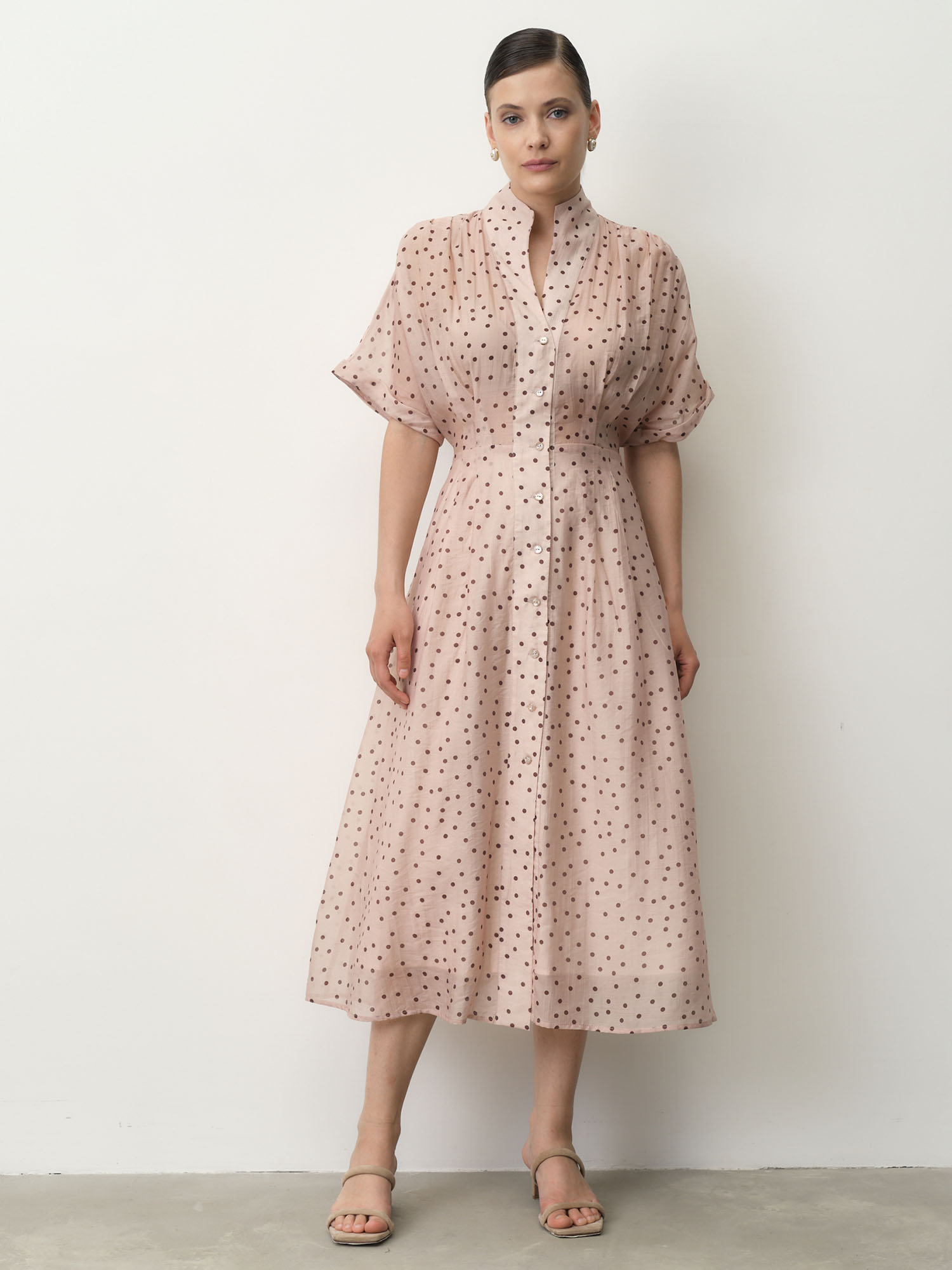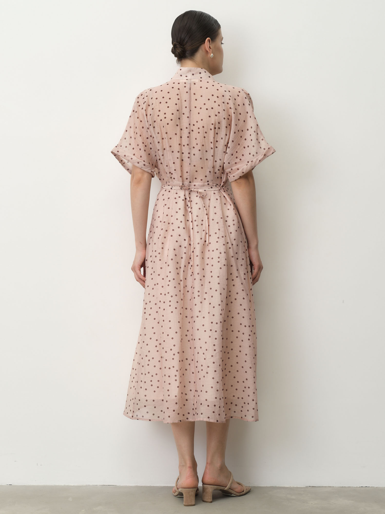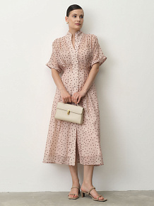 Свободный силуэт с акцентом на талии и длиной миди. Легкие рукава и плавные линии создают воздушный и элегантный образ.