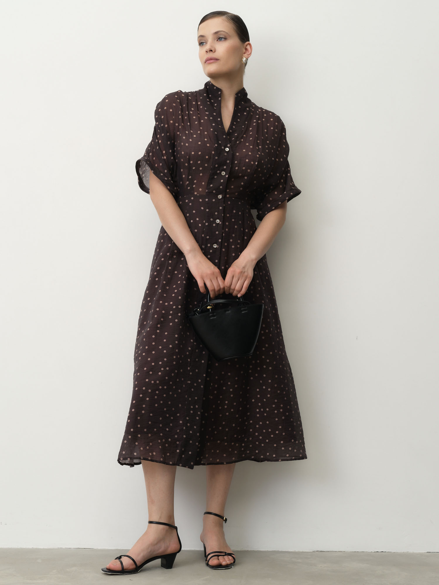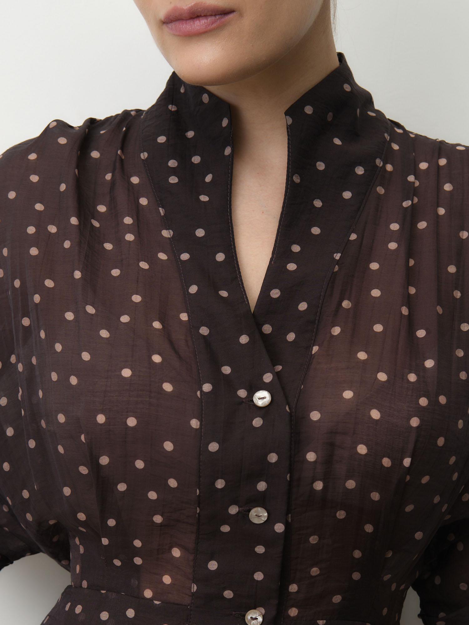 Коричневый в горошек — теплое и стильное сочетание, придающее образу мягкость и выразительность.