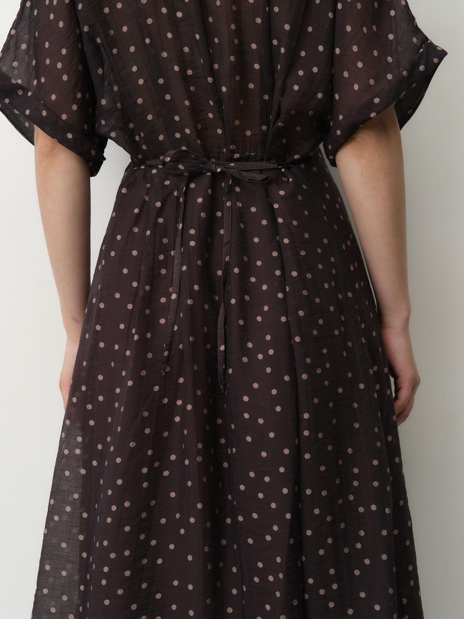 Свободный силуэт с длиной миди и короткими рукавами. Модель с акцентом на легкость и плавные линии, создающие изящный образ.