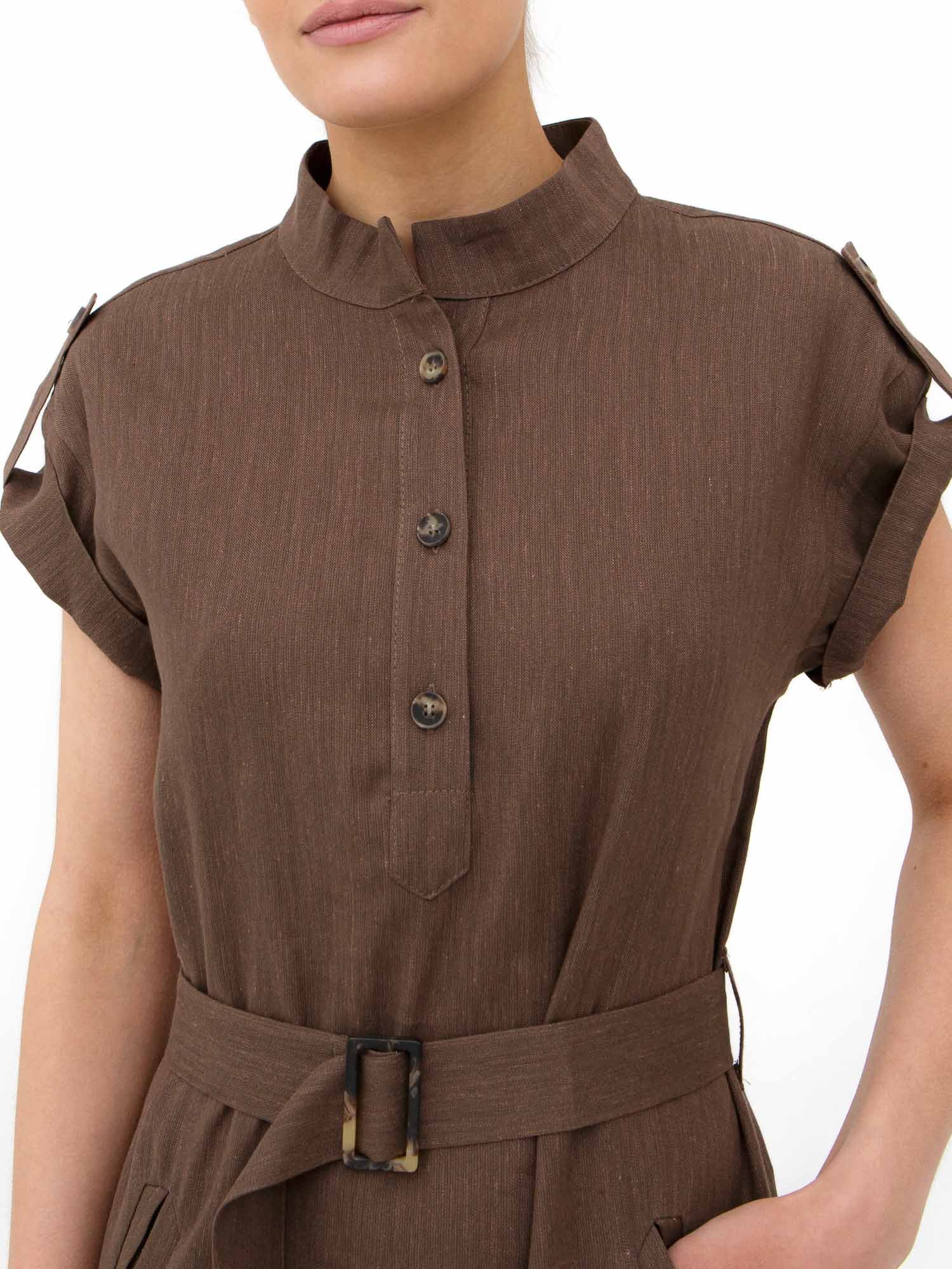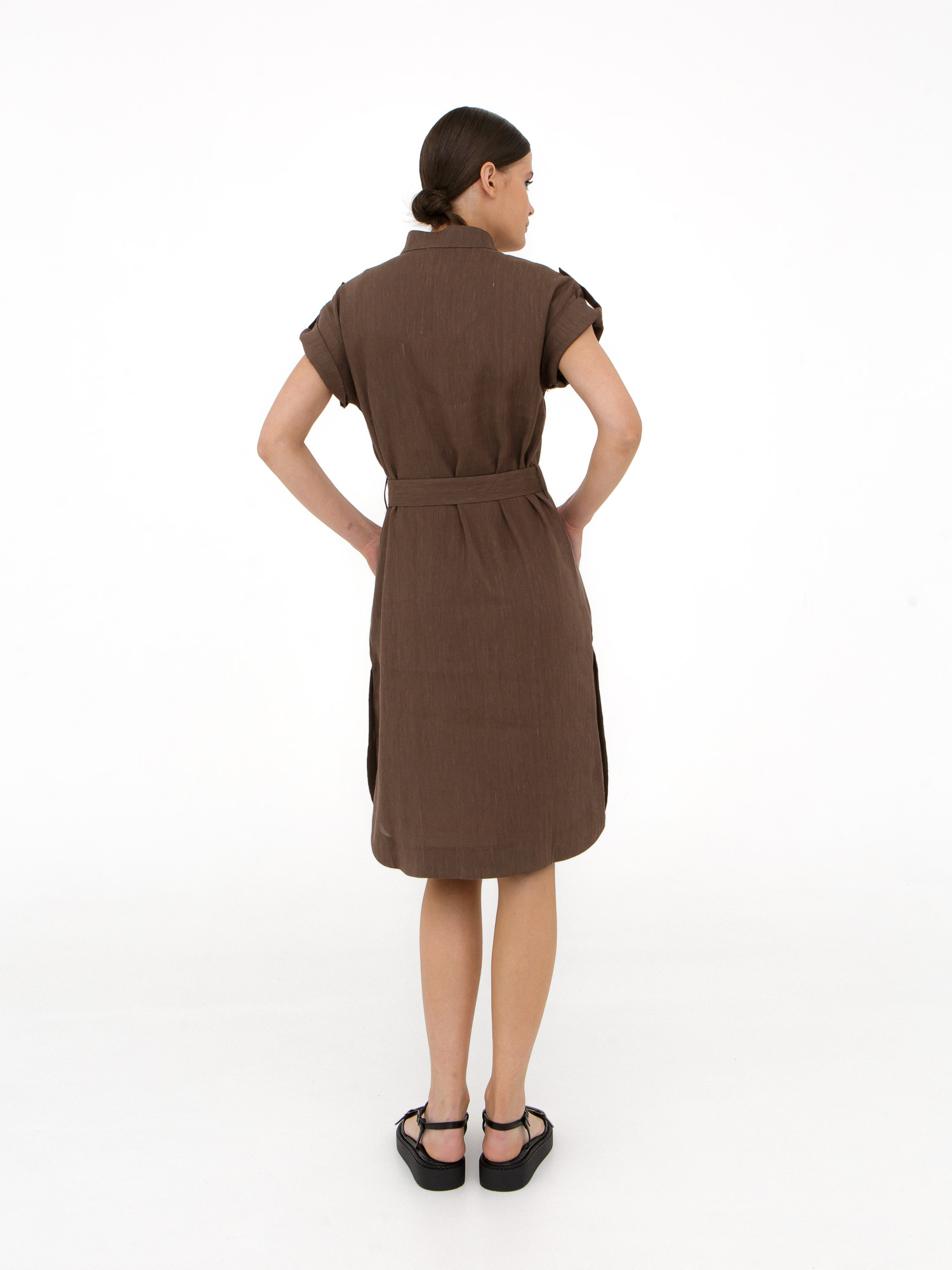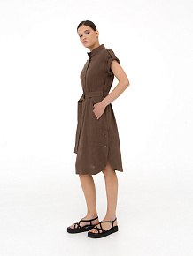 Приталенный силуэт с акцентом на талии благодаря поясу. Верх выполнен в рубашечном стиле с аккуратной стойкой и планкой на пуговицах. Короткие рукава с декоративными элементами придают образу современность, а длина миди делает модель универсальной.