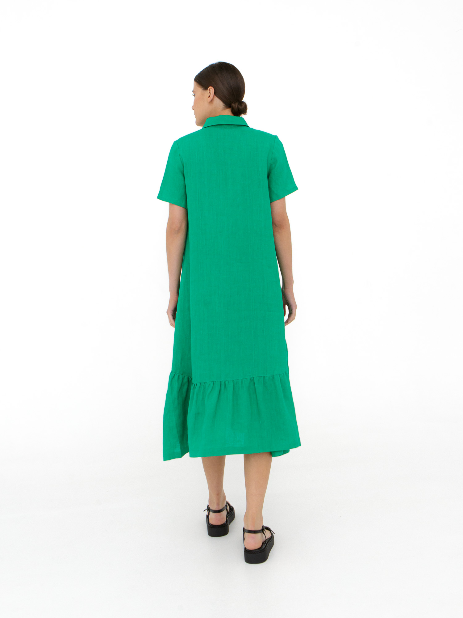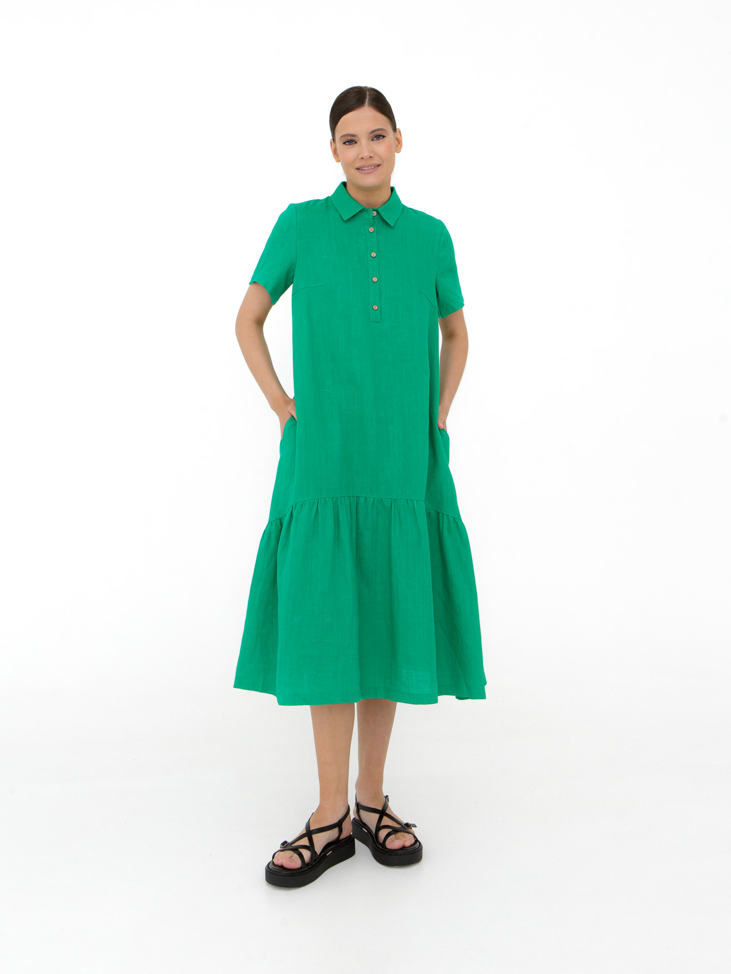 Платье выполнено в рубашечном стиле с прямым свободным кроем. Отложной воротник и застежка на пуговицы придают модели аккуратный и универсальный вид. Нижняя часть с присборенной юбкой добавляет объема и легкости, создавая динамичный и женственный силуэт.