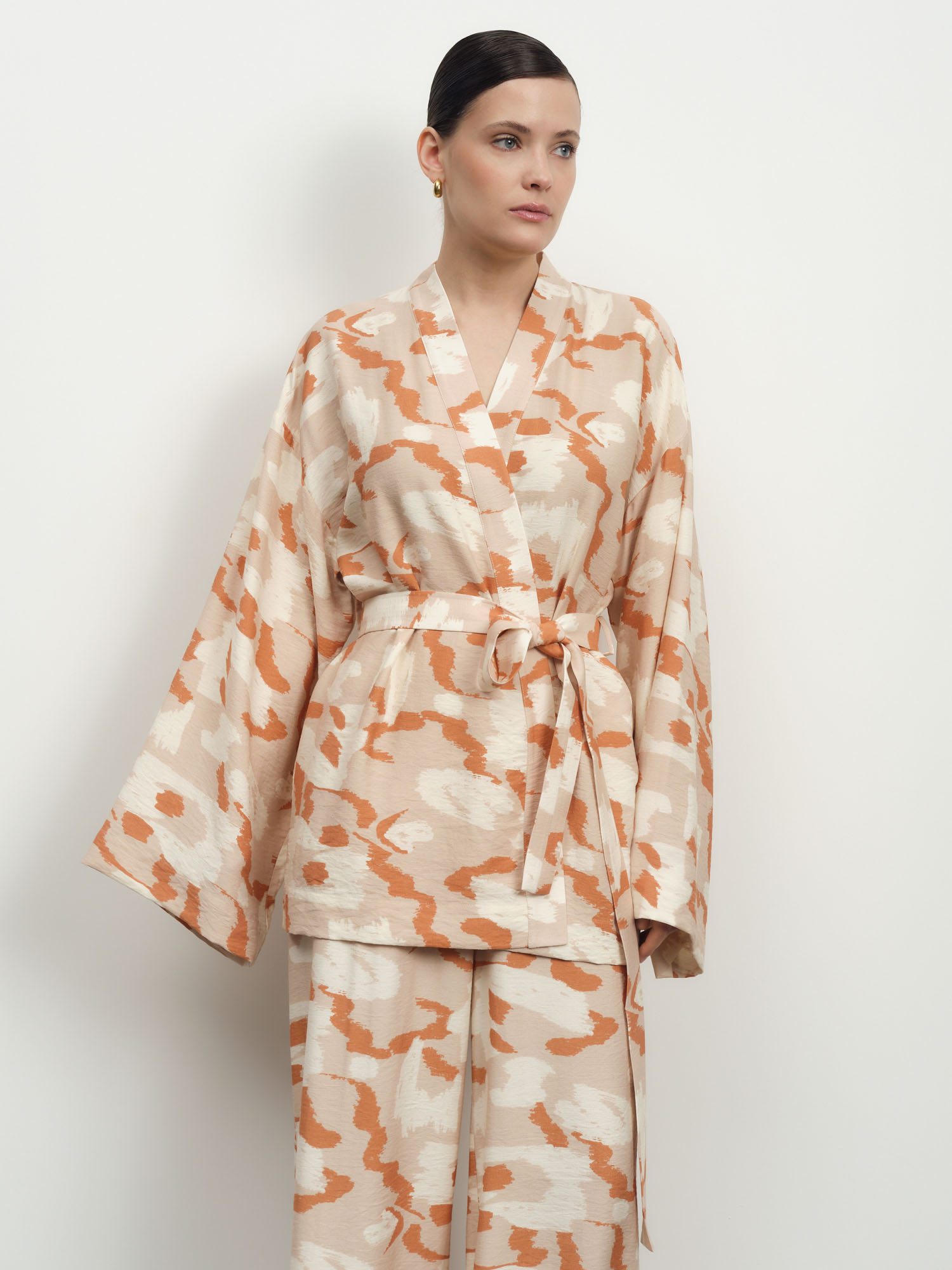 Свободный силуэт в стиле кимоно с запахом. Лаконичный крой дополняется динамичным рисунком, создающим эффектный образ.