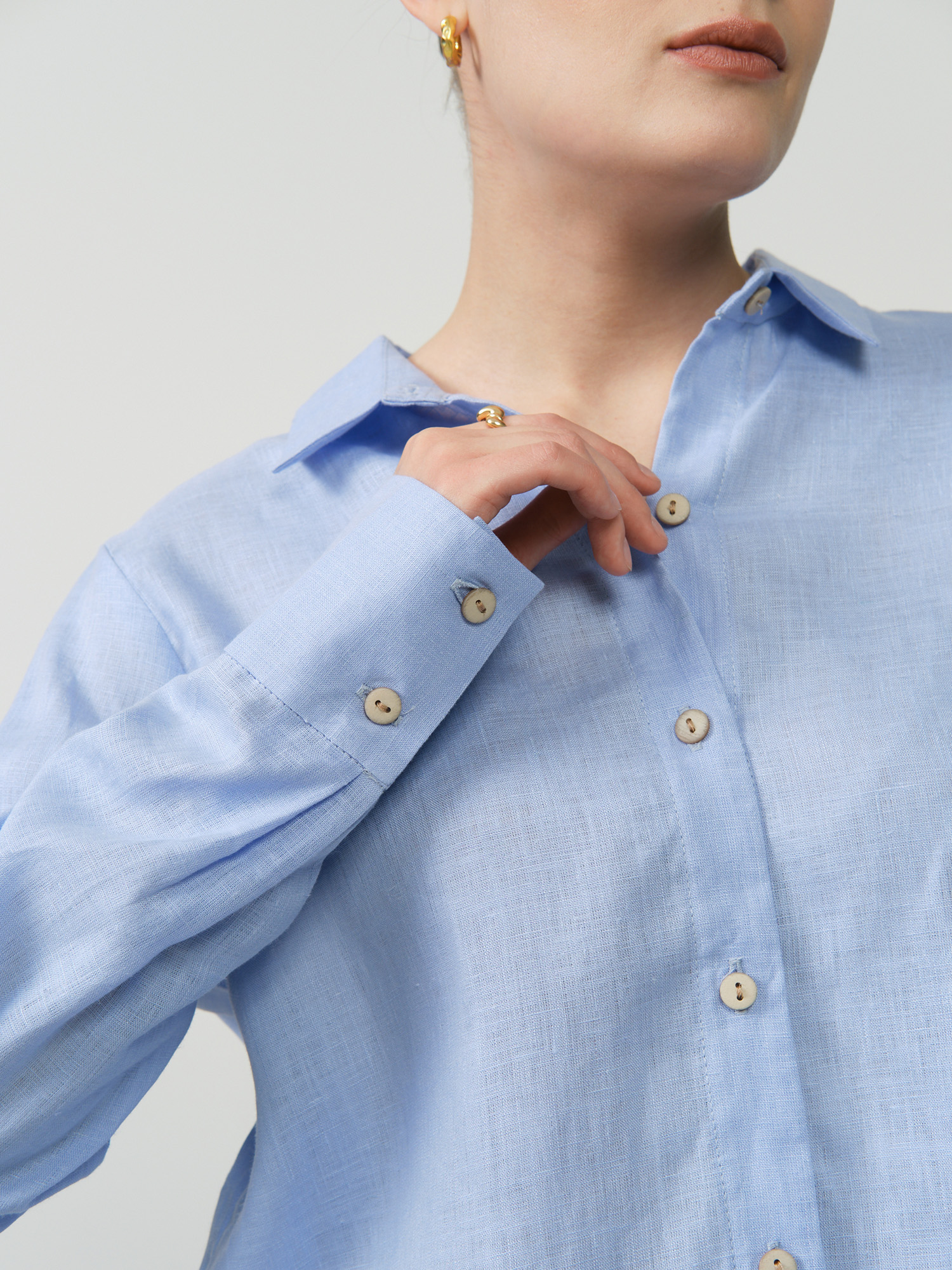 Застёжка на пуговицы, длинные рукава с манжетами, аккуратные швы, лёгкая текстура ткани.