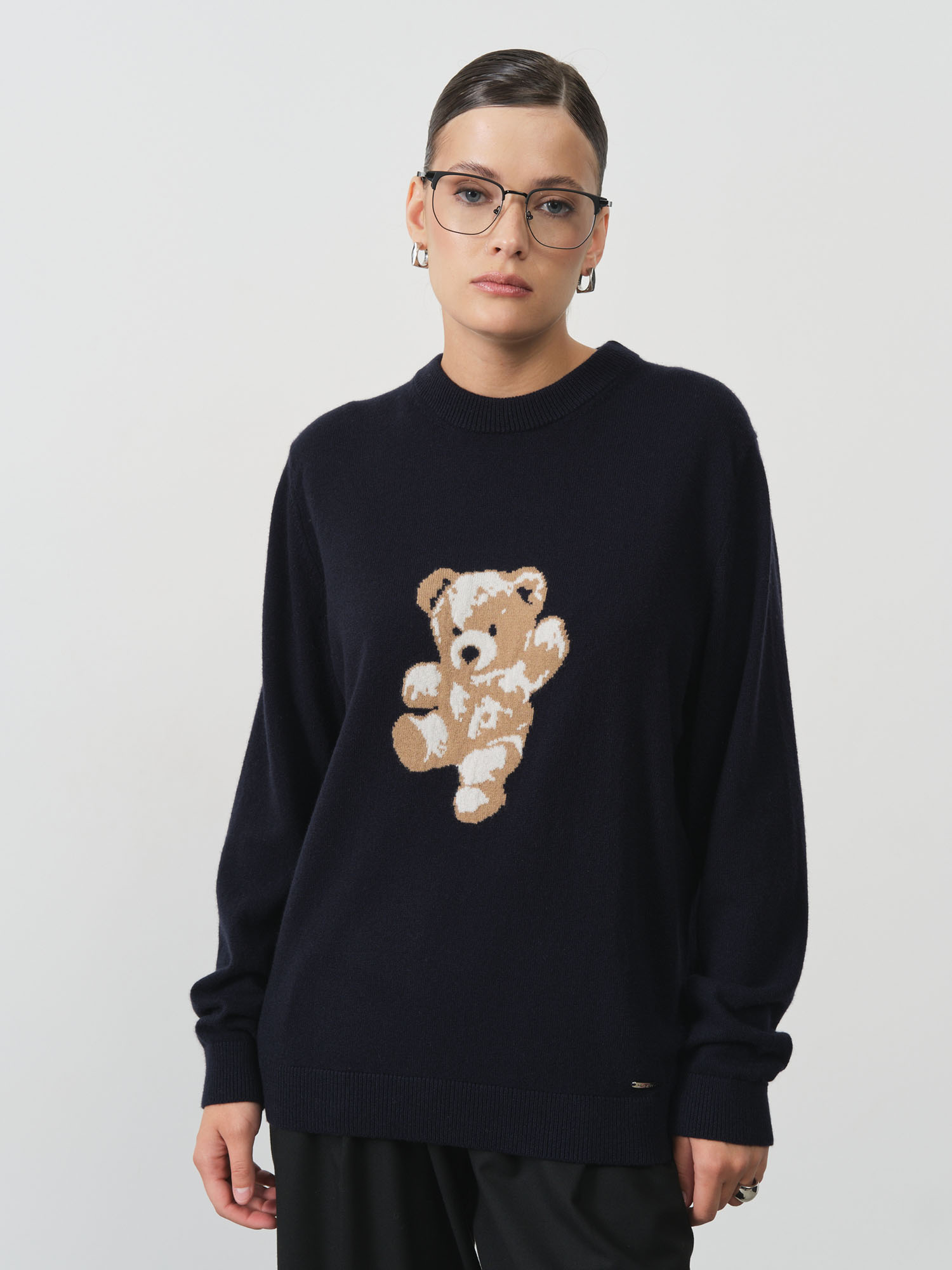 Модель выполнена в прямом силуэте с классическим круглым вырезом и гладкой вязкой. Центральным элементом дизайна является декоративная аппликация медвежонка, которая добавляет изделию индивидуальности и современного настроения.