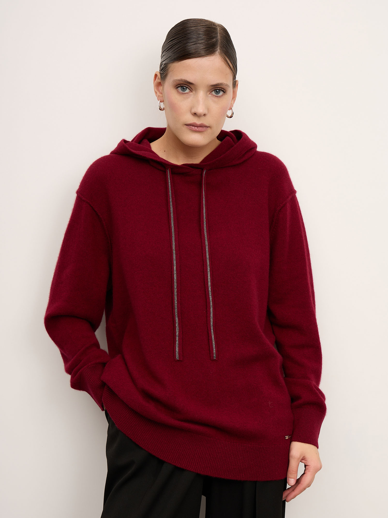 Объёмный джемпер с капюшоном из 100% монгольского кашемира в насыщенном оттенке бургунди — это сочетание уюта, современного кроя и безупречного качества. Мягкий, дышащий материал создаёт ощущение тепла и лёгкости, а глубокий винно-красный цвет придаёт образу выразительность и характер.