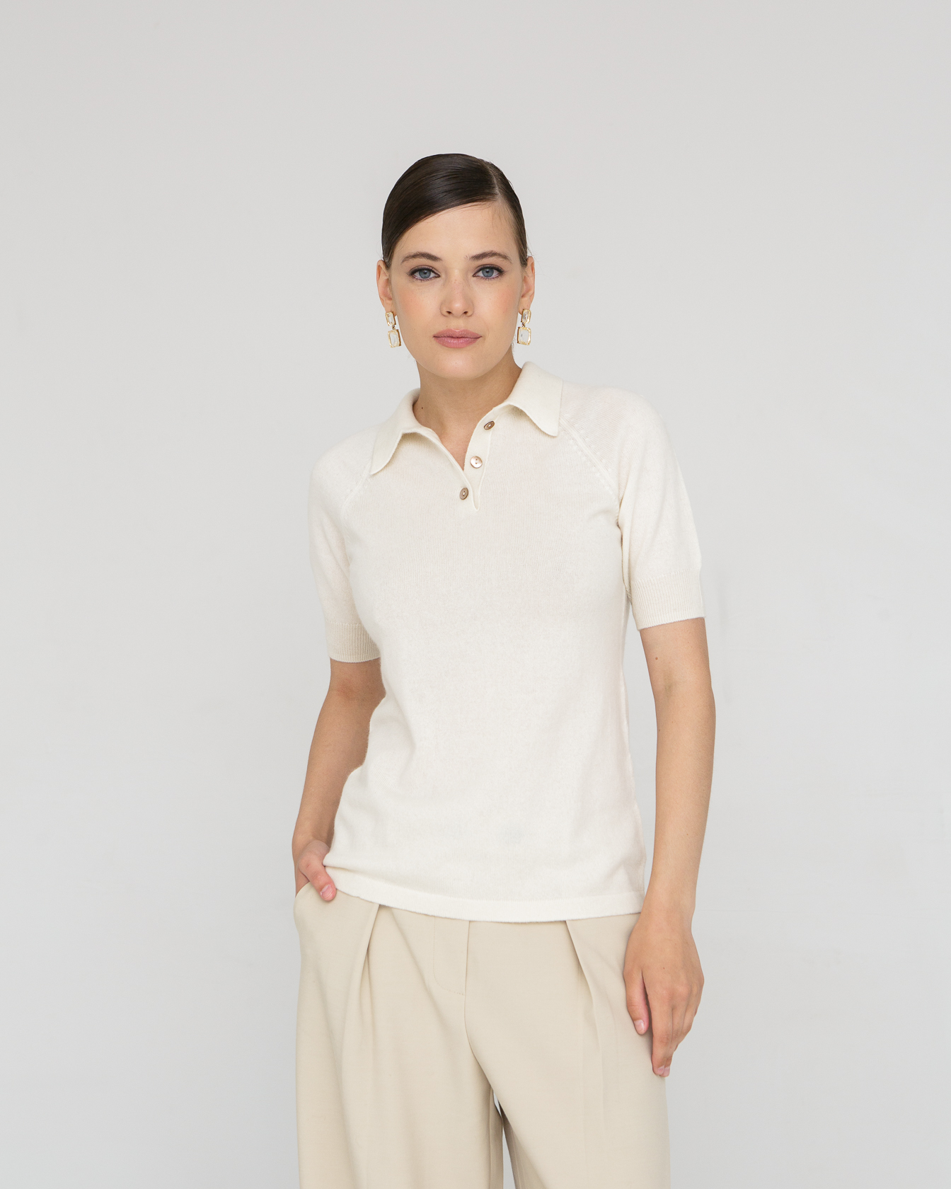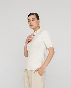 Модель выполнена в стиле поло с отложным воротником и короткими рукавами. Минималистичный крой подчёркивает аккуратность силуэта и делает джемпер универсальным для различных образов.