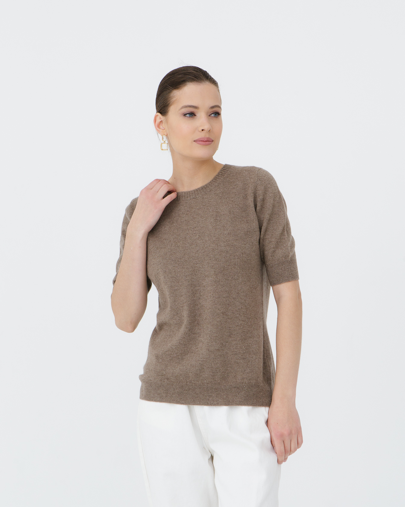 Модель выполнена в минималистичном стиле с круглой горловиной и короткими рукавами. Лаконичный крой подчёркивает универсальность изделия и позволяет легко сочетать его с различными элементами гардероба.