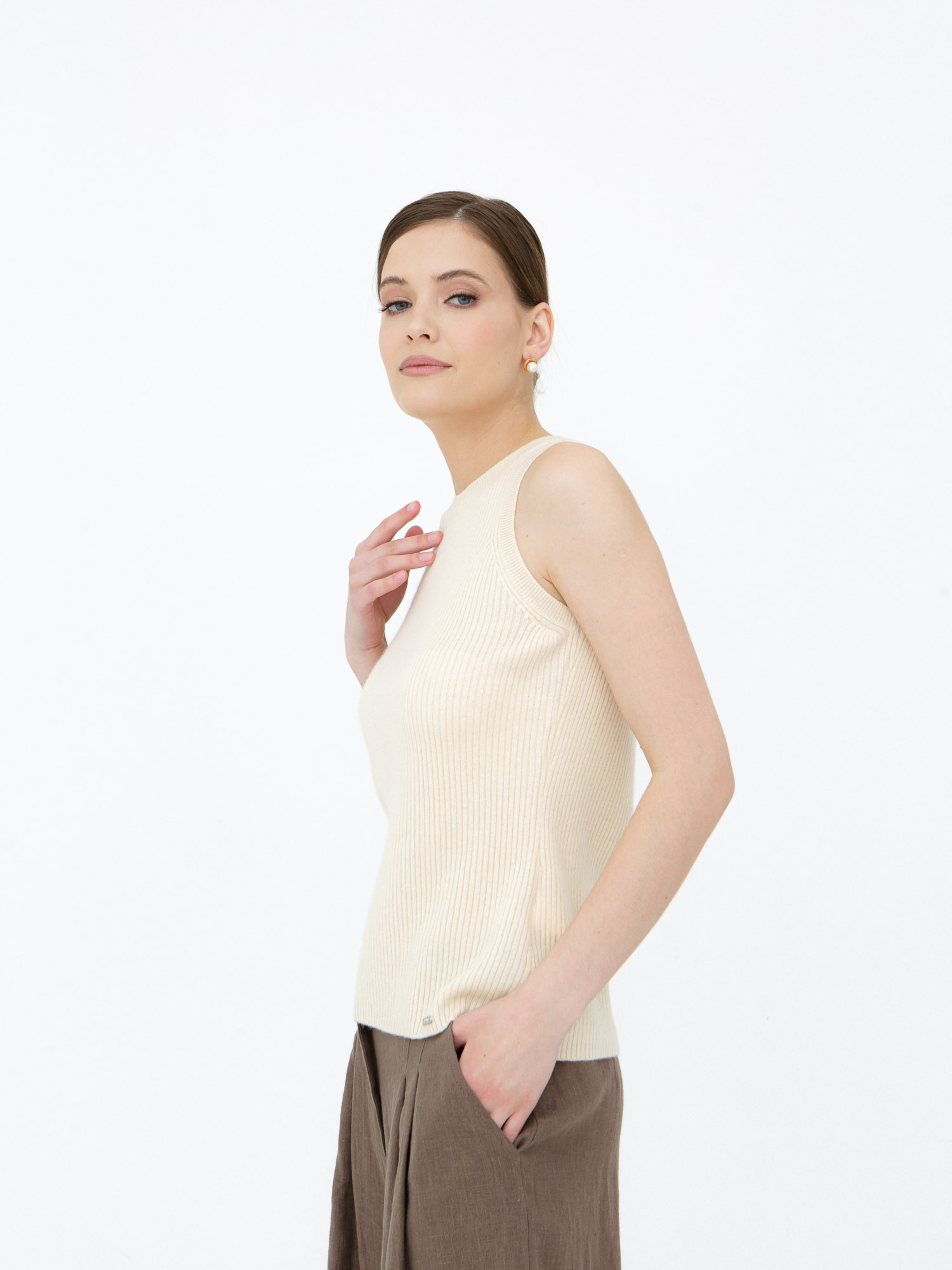Минималистичный дизайн без рукавов с аккуратной круглой горловиной. Эластичная вязка по краю горловины и по низу изделия сохраняет форму и подчёркивает аккуратность силуэта.