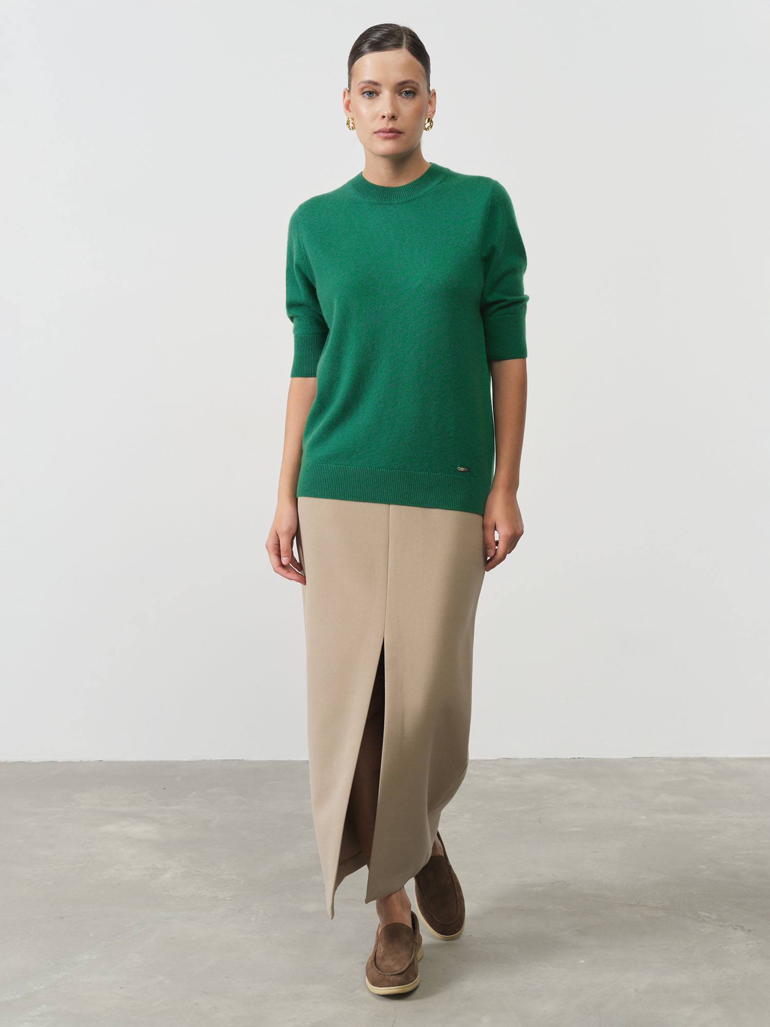 Женский кашемировый джемпер зеленого цвета — это универсальная и стильная модель для повседневного гардероба. Выполнен из мягкого и легкого кашемира, который обеспечивает максимальный комфорт и тепло даже в прохладные дни. Яркий зеленый оттенок освежает образ и добавляет нотку изысканности. Джемпер имеет классический крой с укороченными рукавами, что делает его идеальным выбором для офиса, прогулок или встреч с друзьями. Благодаря универсальному дизайну, он легко сочетается с джинсами, брюками или юбками, создавая разные стильные комбинации.
