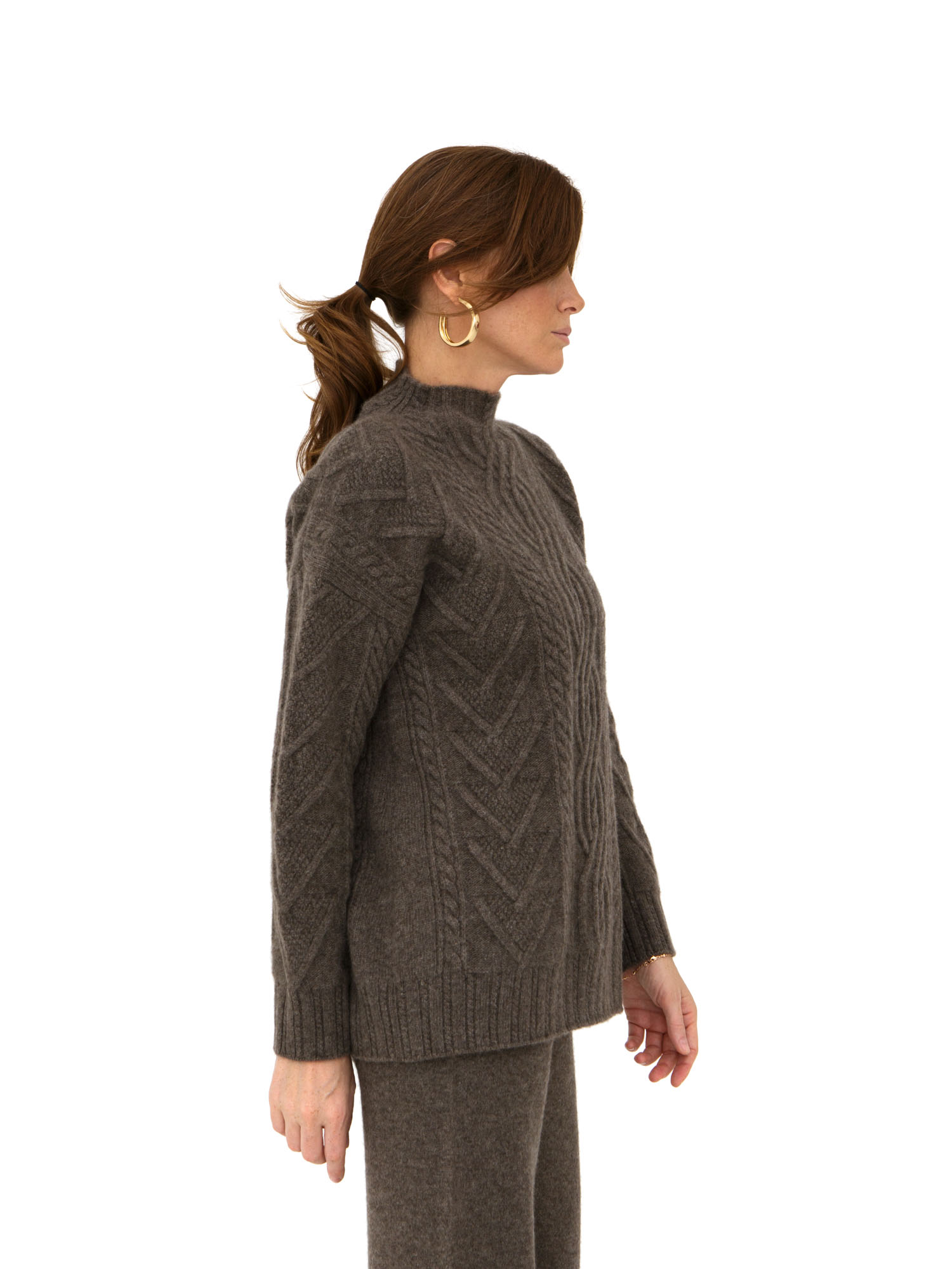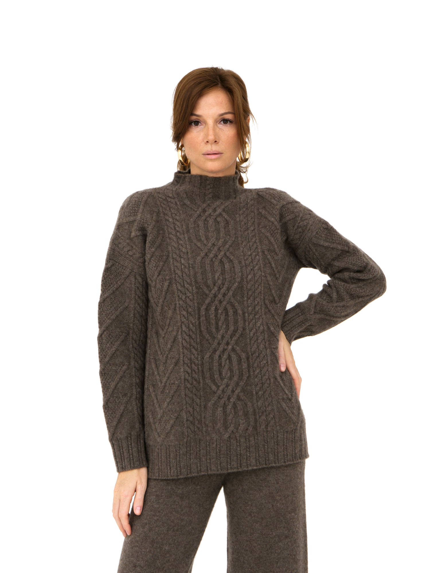 Модель выполнена с высоким воротником и украшена рельефной вязкой с косами. Фактурный узор придаёт изделию выразительность и создаёт эффект объёма, сохраняя элегантный минималистичный стиль.