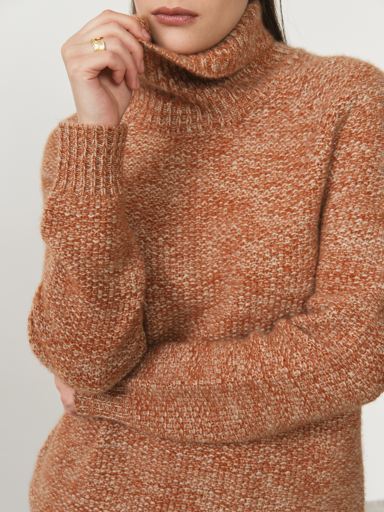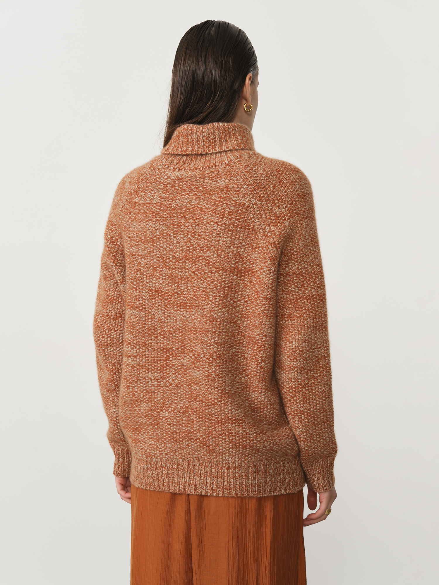 Элегантный кашемировый свитер в рыжем меланжевом цвете — идеальный выбор для тех, кто ценит комфорт и стиль. Мягкий и уютный, он выполнен из высококачественного кашемира, который дарит нежное прикосновение к коже и сохраняет тепло в холодные дни. Свитер отличается классическим дизайном с высоким воротом, обеспечивающим дополнительную защиту от холода.