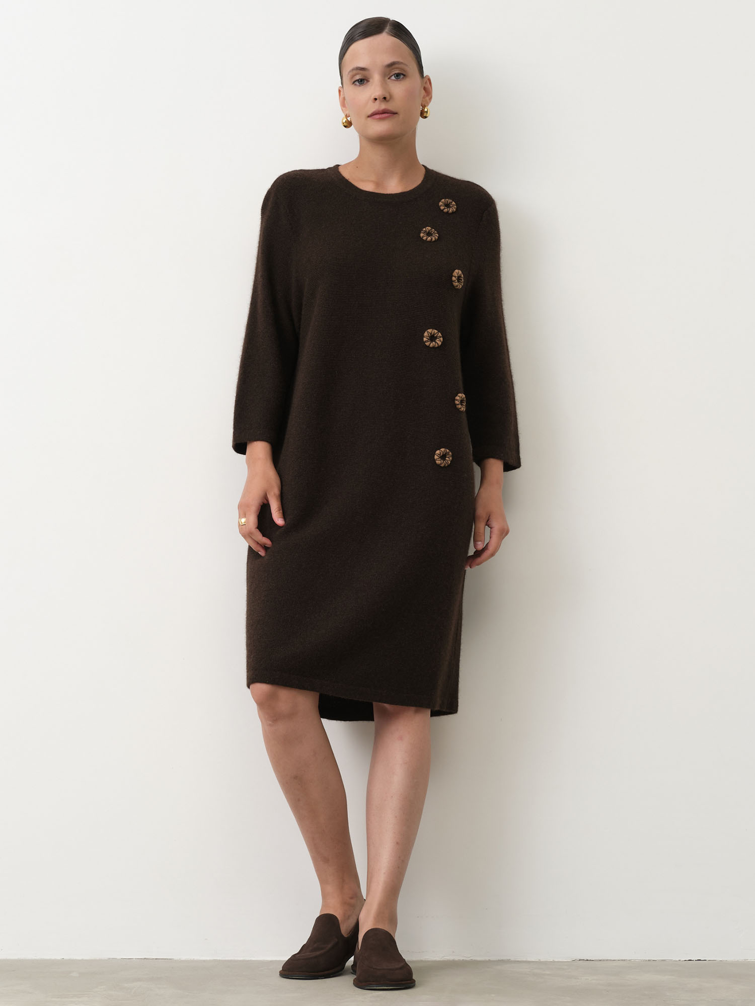 Модель выполнена в прямом силуэте с округлой горловиной и рукавами длиной 3/4. Лаконичный крой дополнен декоративными элементами, придающими изделию индивидуальность.