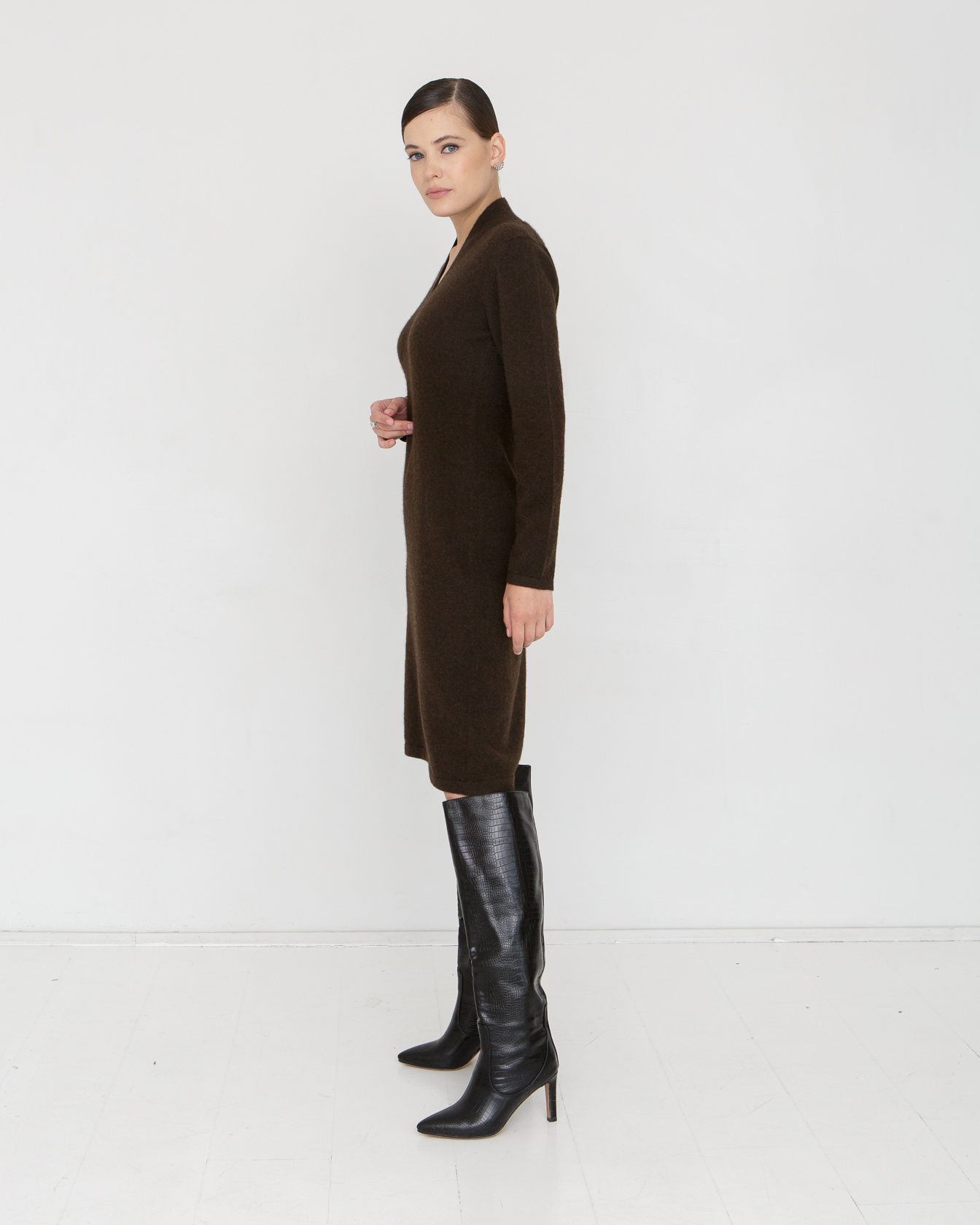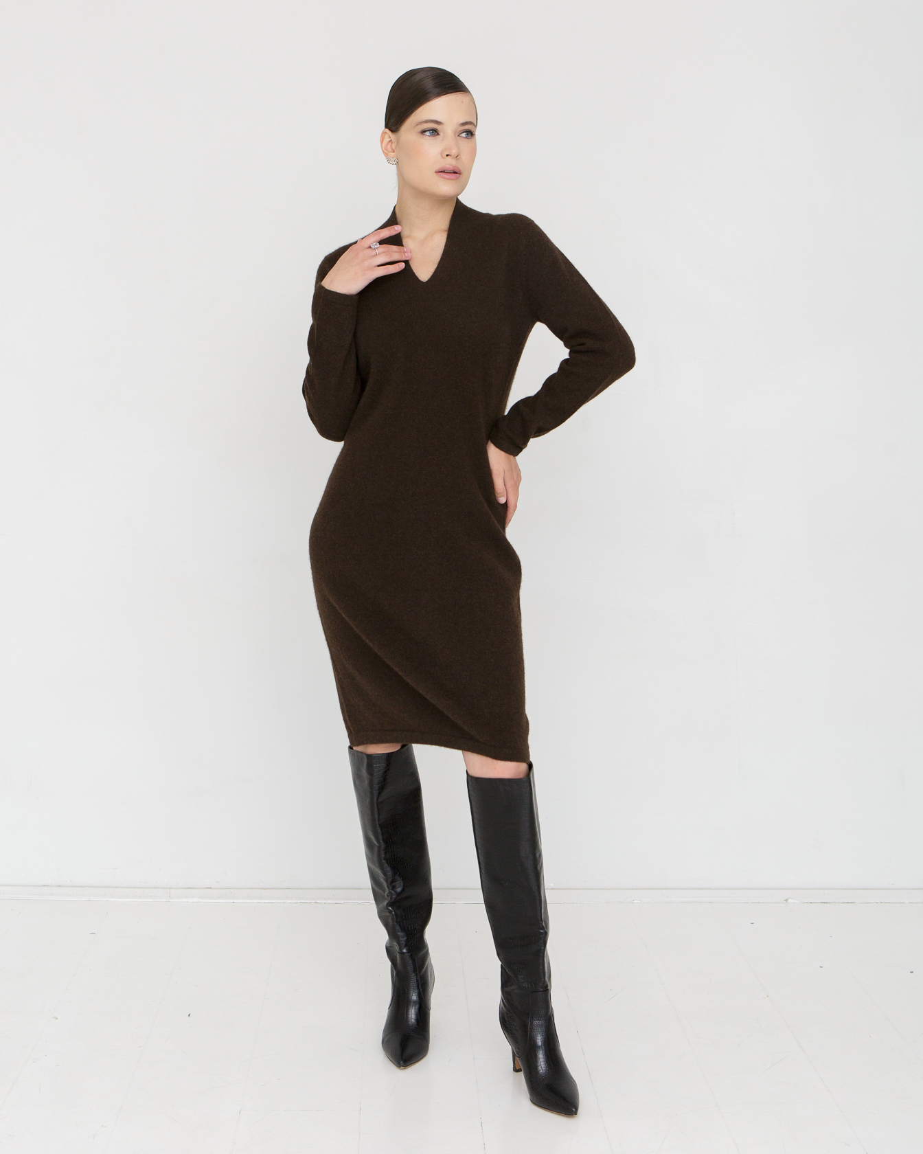 Модель выполнена в полуприлегающем силуэте с V-образным вырезом и длинными рукавами. Лаконичный крой подчёркивает фигуру, сохраняя удобство и свободу движений.